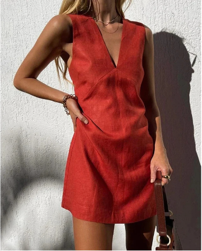 Denne ærmeløse sommerkjole er perfekt til varme dage med sin lette og luftige pasform. Den dybe V-hals og figursyede silhuet fremhæver din feminine side, mens det enkle design gør den velegnet til både afslappede og festlige lejligheder. Kombinér den med en stråtaske og sandaler for det ultimative sommerlook.