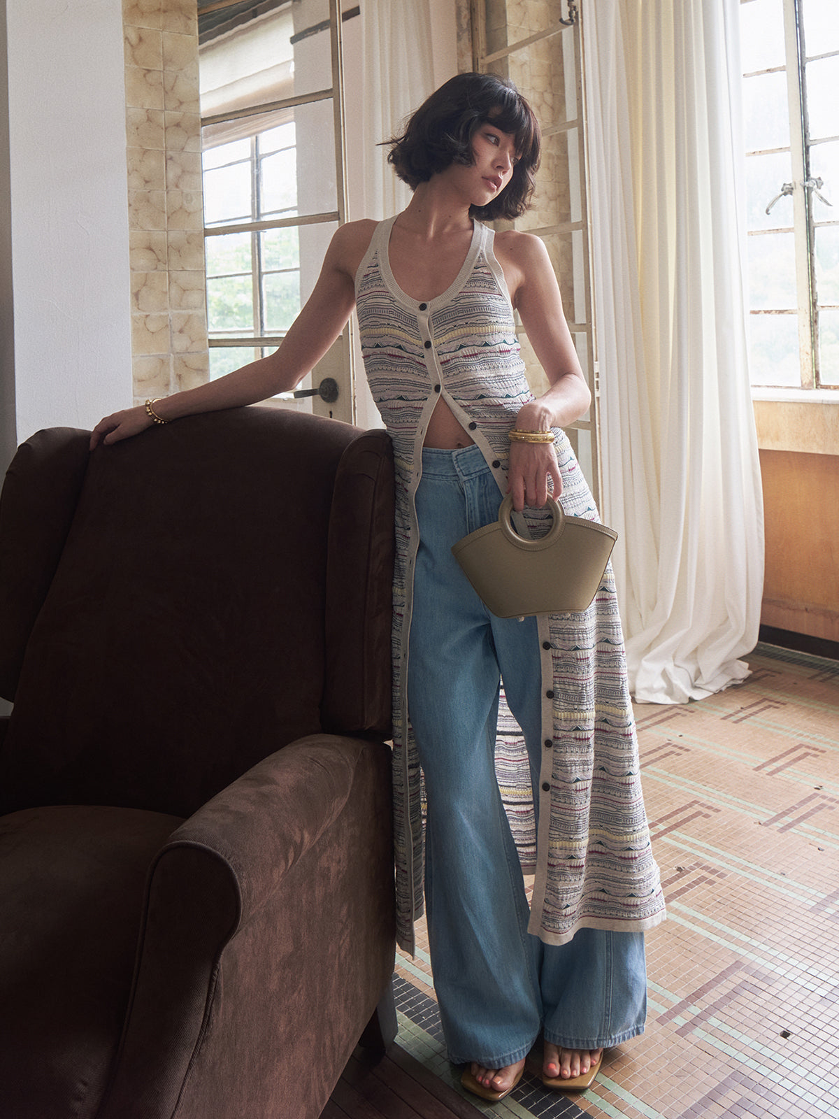 Denne lange strikvest kombinerer en luftig, åben struktur med dekorative knapper og en afslappet pasform. Det ærmeløse design og det let bølgende snit gør den ideel til sommerdage eller som en stilfuld overdel til denim og toppe. Et kreativt og alsidigt valg til bohemeelskeren.