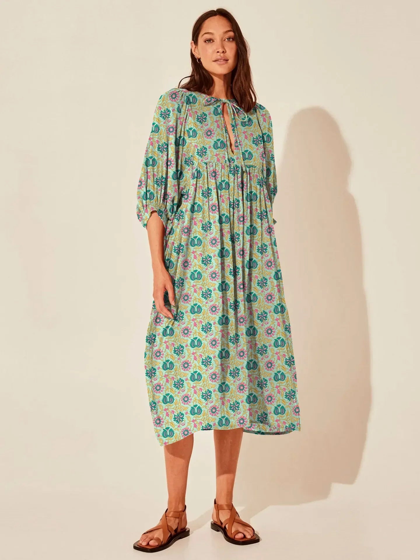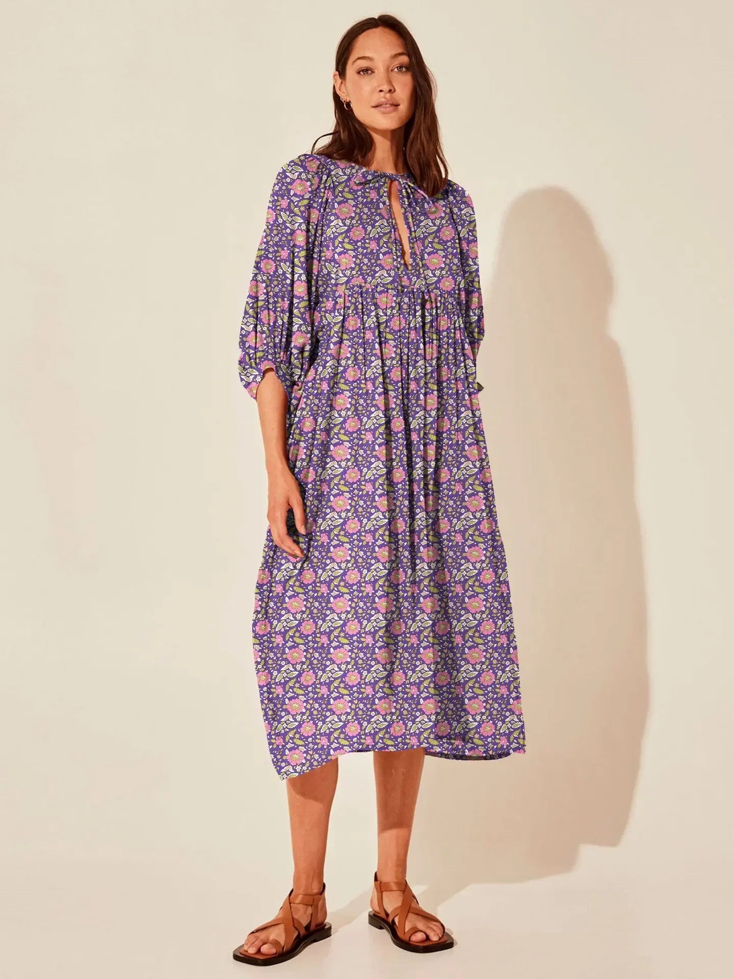 Denne luftige midi kjole kombinerer et afslappet snit med et feminint og boheme-inspireret design. Med bløde ballonærmer og en elegant V-udskæring med bindebånd tilfører kjolen et unikt og stilfuldt look. Det lette materiale gør den ideel til varme dage, mens det farverige blomsterprint giver en iøjnefaldende og trendy stil. Perfekt til både hverdag og ferier.
