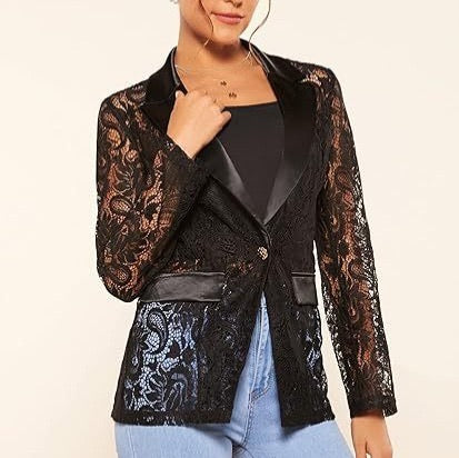 Denne unikke blazer har et sofistikeret design med fine blonder og eksklusive satin-detaljer. Det figursyede snit skaber en smigrende silhuet, mens de gennemsigtige ærmer tilføjer et moderne og sensuelt touch. Perfekt til både festlige lejligheder og stilfulde hverdagslooks.
