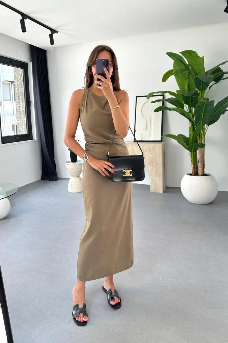 Denne smukke midi kjole har et enkelt, men stilfuldt design, der gør den ideel til både hverdag og formelle lejligheder. Den figursyede silhuet fremhæver kroppens linjer, mens det lette materiale sikrer komfort hele dagen.