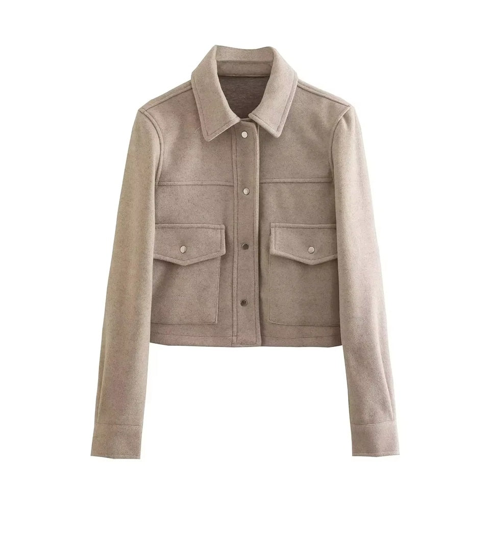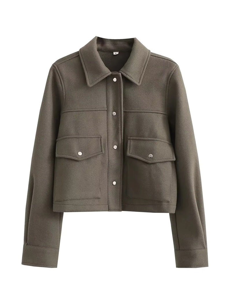 Denne korte uldjakke er det perfekte mix af stil og komfort. Det klassiske skjortedesign kombineret med blødt, uldlignende materiale skaber en elegant, men afslappet jakke, der passer til enhver lejlighed. De praktiske brystlommer og trykknaplukningen giver et cool, moderne touch, mens den korte pasform gør den ideel til at style med jeans og en tætsiddende top.