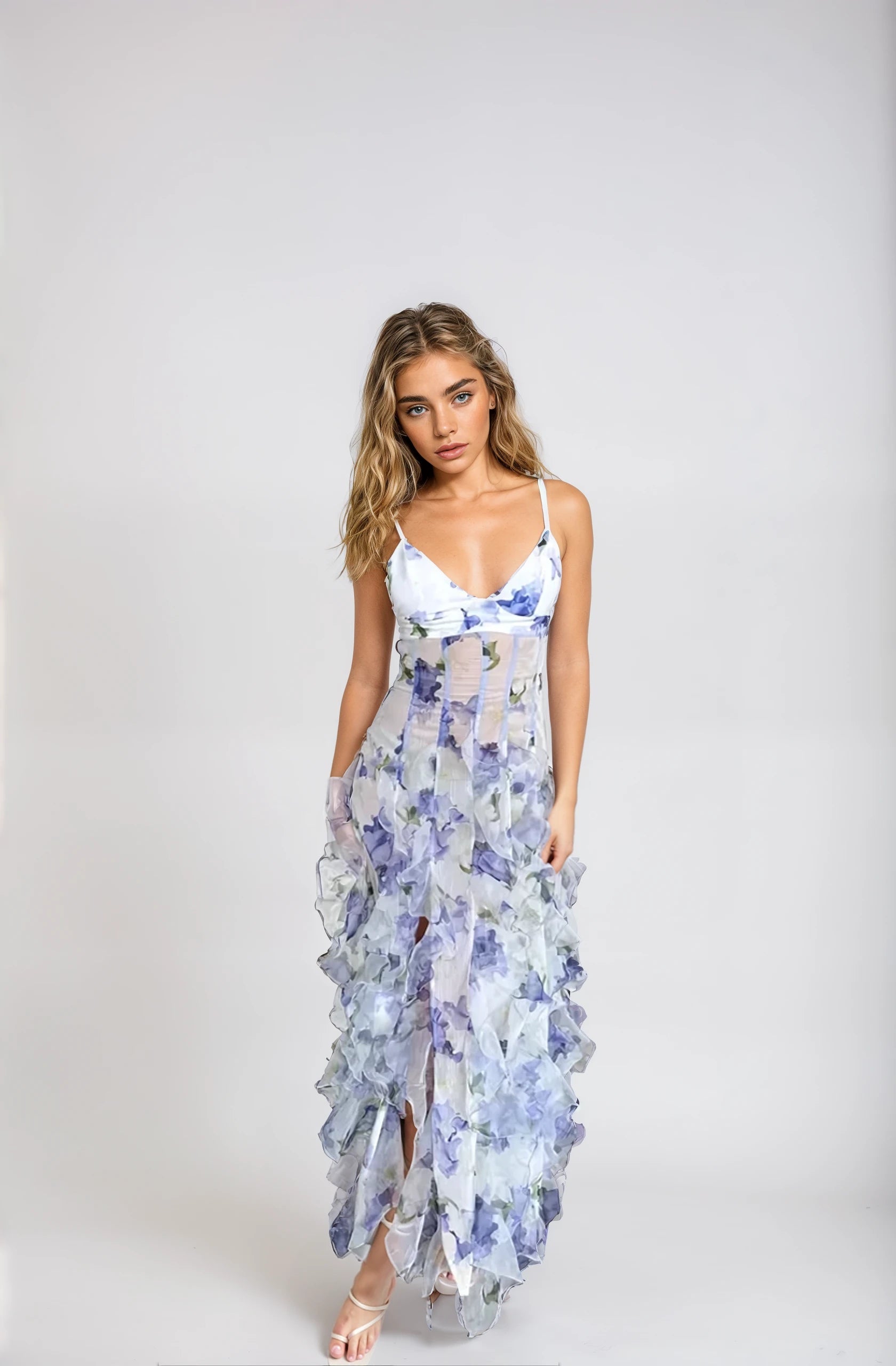Denne lange, blomstrede sommerkjole er det ideelle valg til alt fra bryllupper til strandfester. Fremstillet af let chiffon, tilbyder den en kombination af elegance og komfort. Det romantiske blomsterprint og de tynde stropper skaber et feminint og luftigt design, der gør dig til midtpunktet ved enhver anledning. Uanset om det er en aften ude eller en dag ved stranden, vil denne kjole få dig til at stråle.
