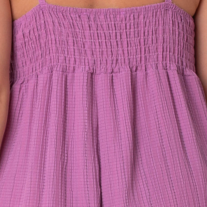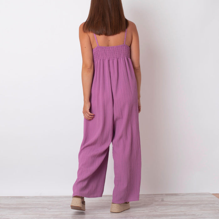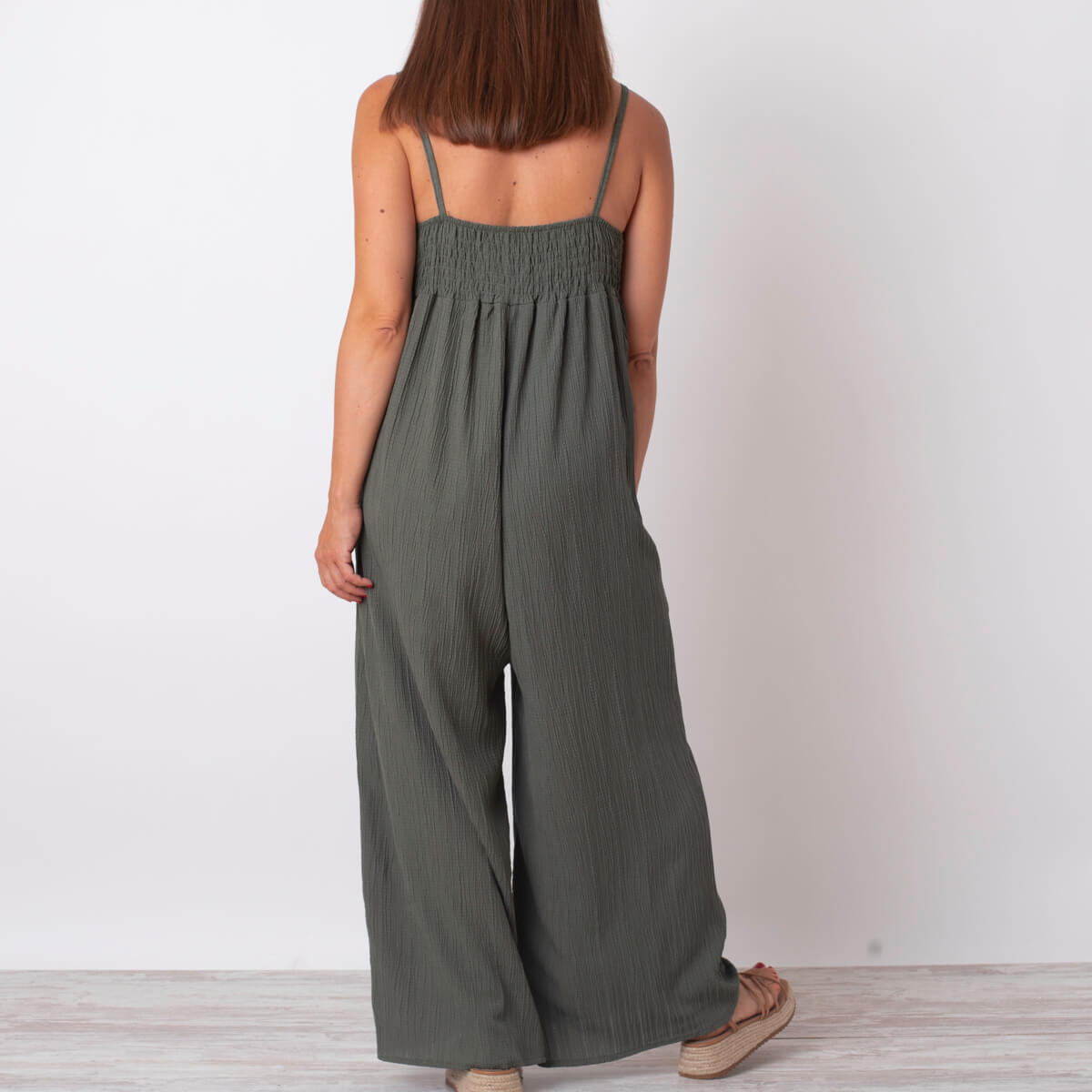 Denne løstsiddende jumpsuit kombinerer afslappet komfort med et stilfuldt design. De justerbare spaghettistropper og knaplukningen foran tilføjer et feminint touch, mens den brede benpasform sikrer en luftig og let bevægelse. Det bløde, åndbare materiale gør den perfekt til både afslappede dage og sommerlige udflugter.