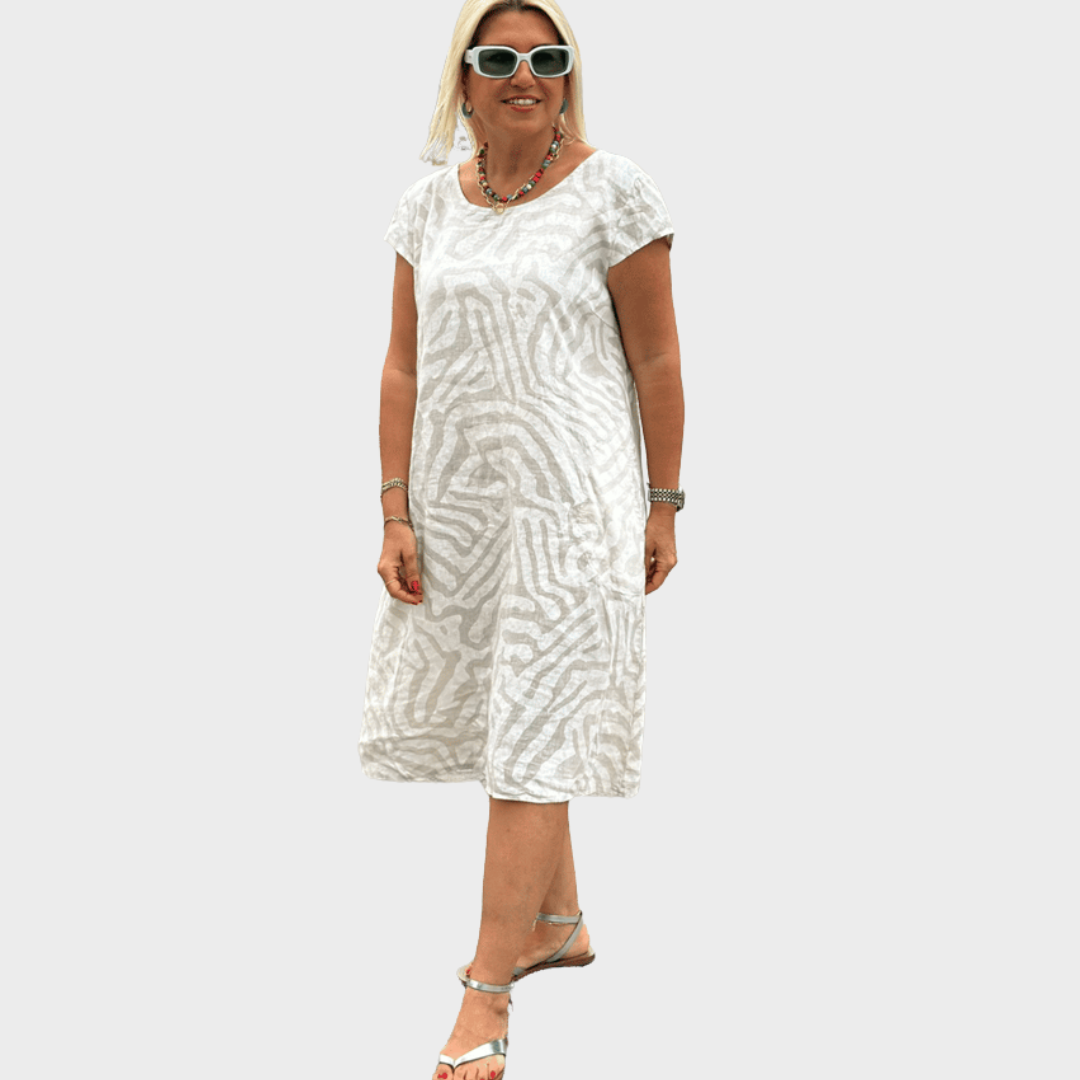 Denne luftige sommerkjole kombinerer et afslappet snit med et stilfuldt mønster, der giver et moderne og sofistikeret udtryk. Det lette stof sikrer maksimal komfort, mens det løse design gør den perfekt til både strandture og sommerlige byture.