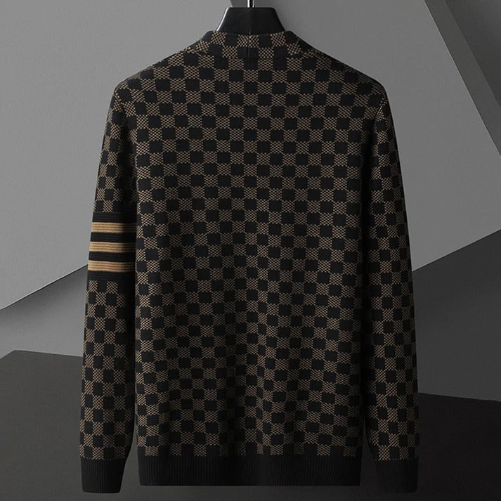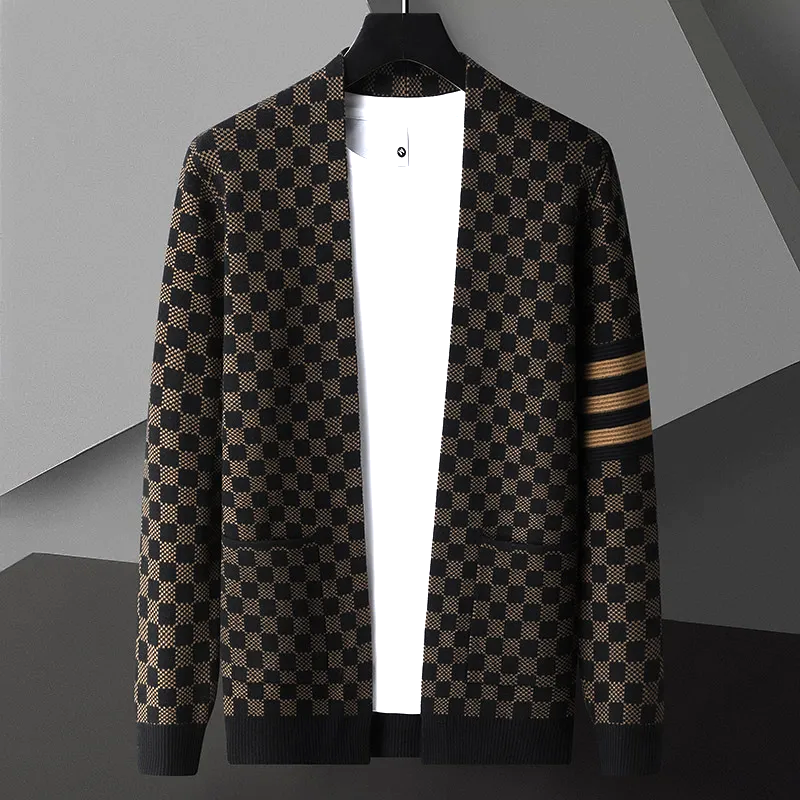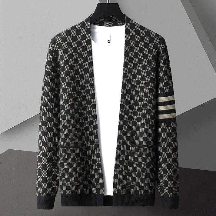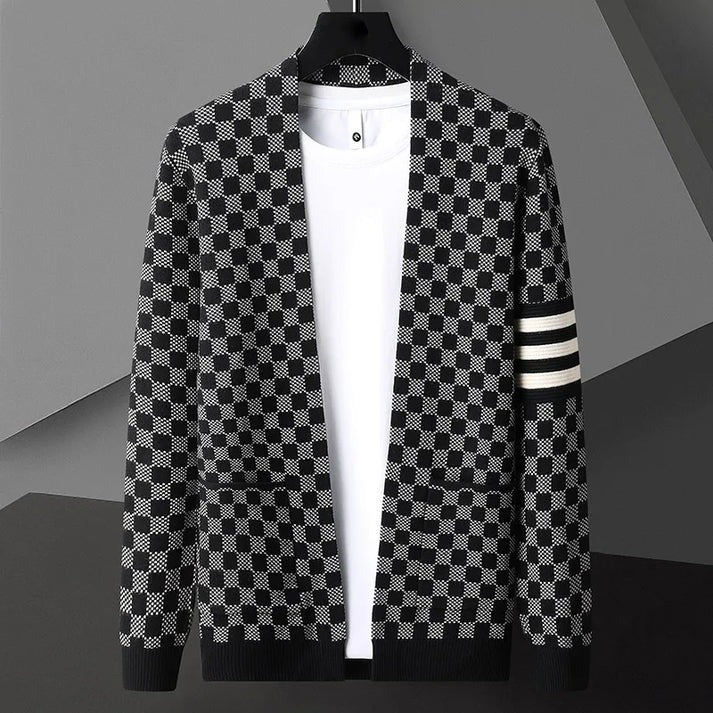 Leder du efter en cardigan, der kombinerer grafisk elegance med afslappet komfort?