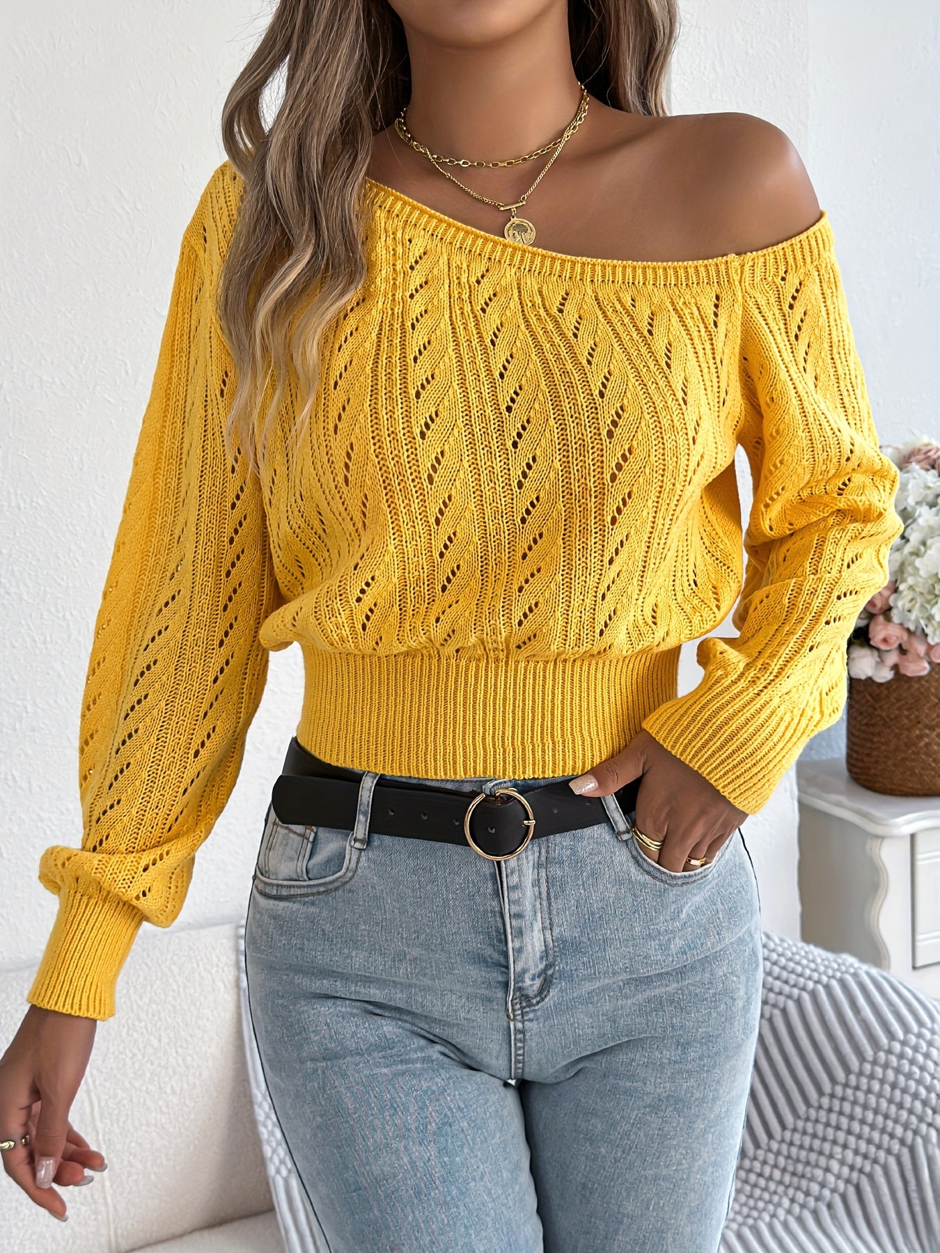 Denne stilfulde off-shoulder strikbluse kombinerer et feminint design med en afslappet pasform. Den åbne skulderdetalje og det delikate hulmønster giver et sofistikeret look, mens den ribbede kant sikrer en flot pasform. Perfekt til både hverdag og festlige anledninger.