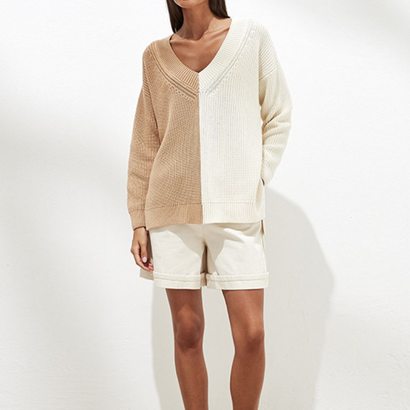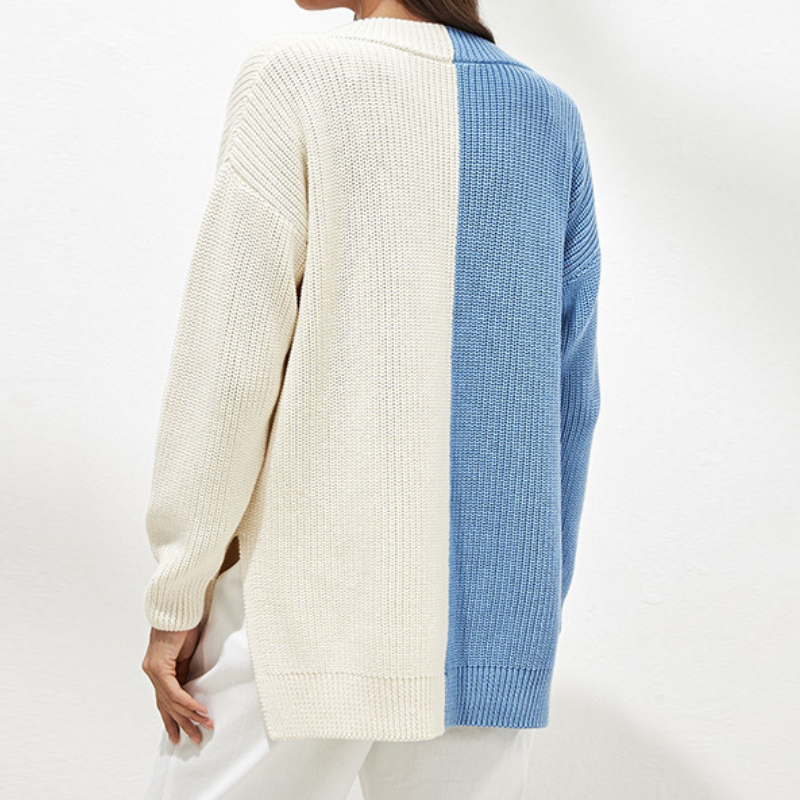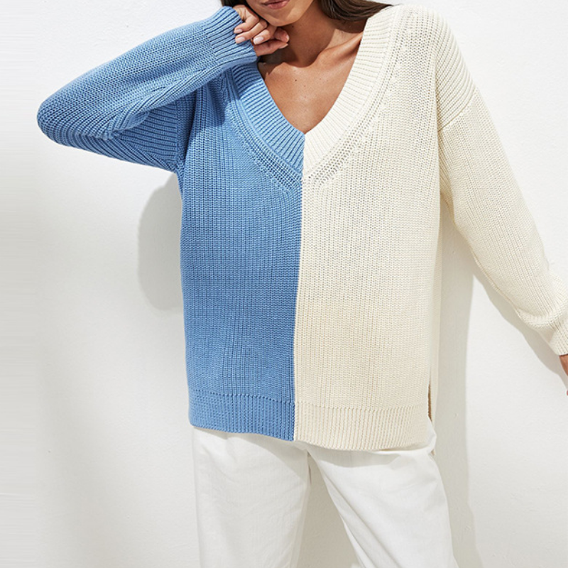 Denne oversized striktrøje er det perfekte valg til et afslappet og stilfuldt look. Med sit trendy tofarvede design og dybe V-hals tilfører den et moderne touch til enhver garderobe. Det løse snit sikrer en behagelig pasform, der er perfekt til både hverdagsbrug og afslappede anledninger.
