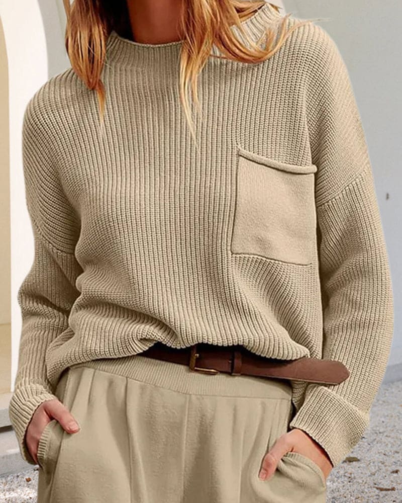 Denne ribstrikkede pullover er det ideelle valg til dage, hvor komfort og stil skal gå hånd i hånd. Med en løs pasform og enkel brystlomme tilføjer den et uformelt og moderne udtryk til din garderobe. Den høje, runde hals og det fine strikmønster gør den både varm og let at style.
