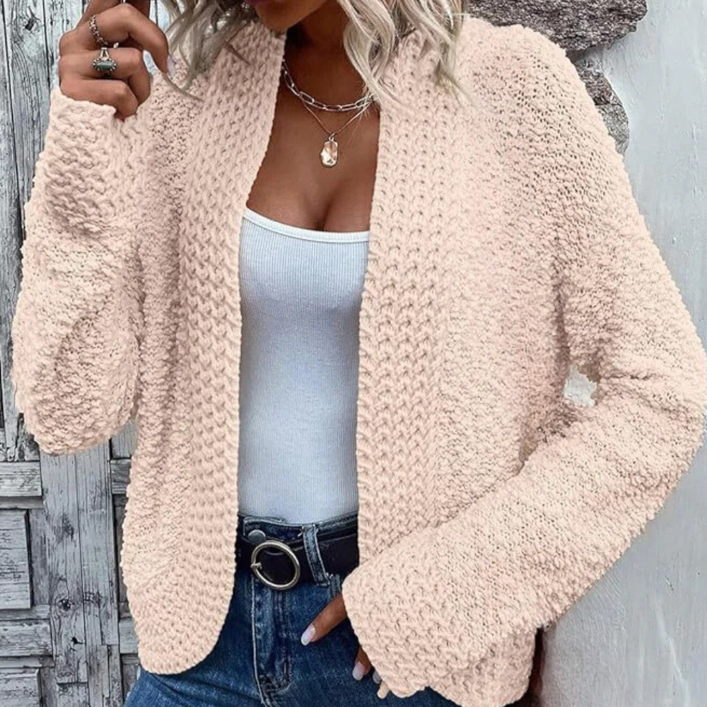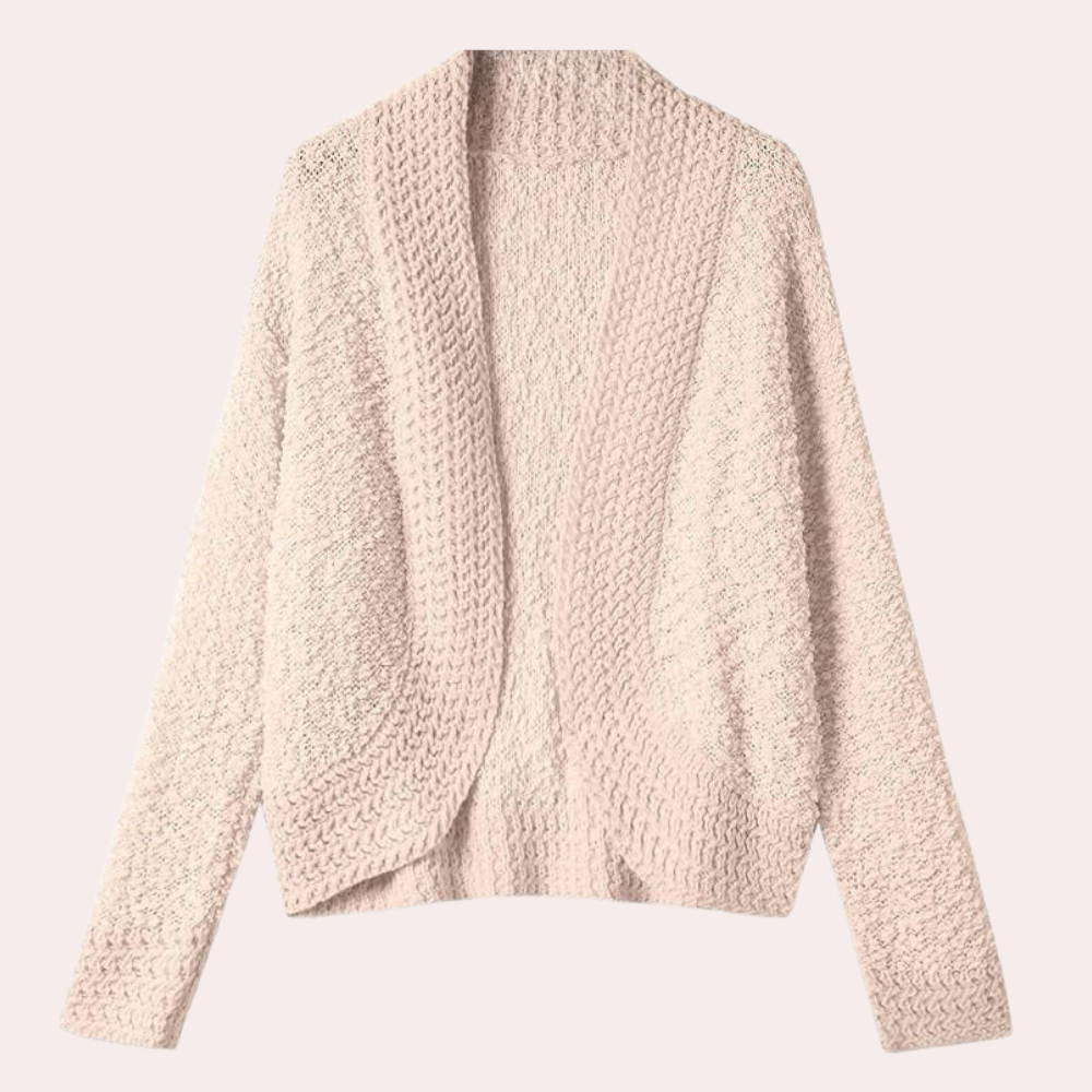 Denne hyggelige strikcardigan er designet med en luksuriøs bouclé-struktur, der giver et blødt og elegant look. Den åbne front og afslappede pasform gør den perfekt til lag-på-lag styling, mens de brede ærmer sikrer ekstra komfort. Ideel til både afslappede dage og sofistikerede outfits.