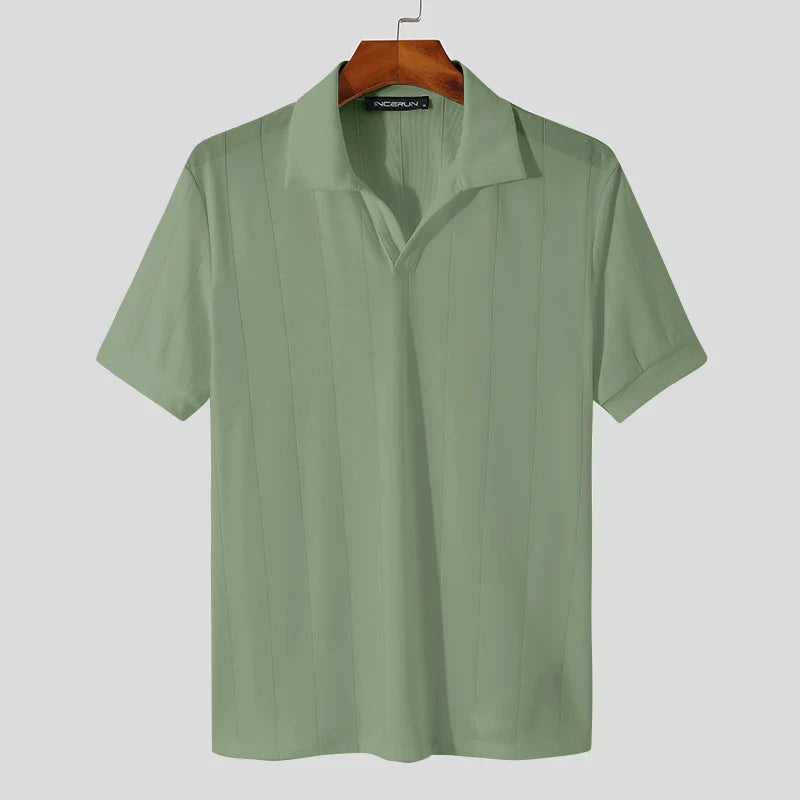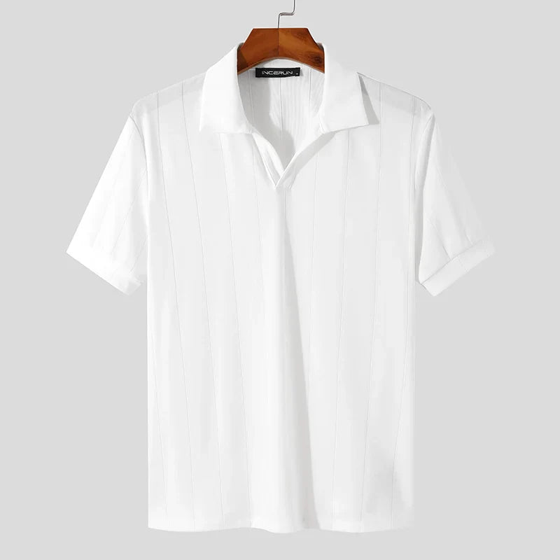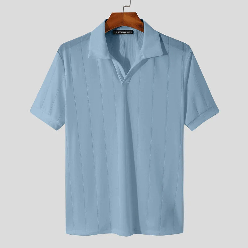 Denne strikkede polo T-shirt bringer en sofistikeret opdatering til den klassiske herregarderobe. Det lette og åndbare materiale sikrer komfort hele dagen, mens det diskrete mønster og den åbne krave tilfører et moderne touch. Perfekt til både afslappede og formelle anledninger.