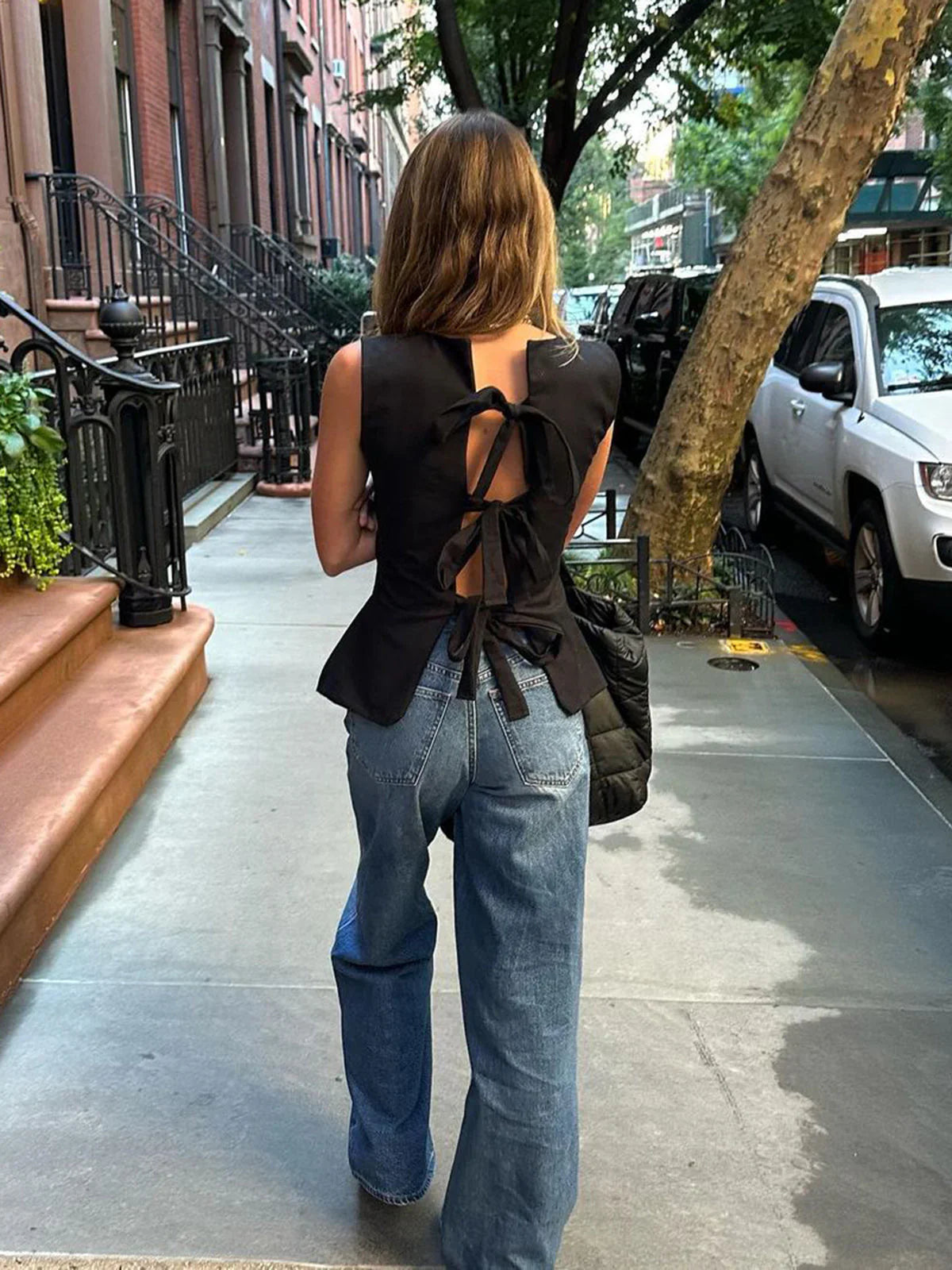 Denne trendy bindetop giver et unikt twist til din garderobe med sine dekorative sløjfer og åbne frontdetaljer. Den let figursyede pasform og bløde stof sikrer komfort og en flatterende silhuet. Perfekt til både afslappede og stilfulde outfits, uanset om du skal ud eller nyde en dag i byen.