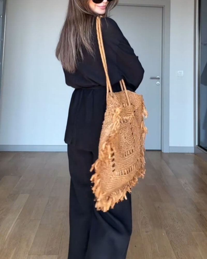 Oplev vores Elegante To-Delte Sæt med Bindebælte, designet til at give et sofistikeret og tidløst look. Sættet består af en lang, flydende jakke med et smigrende bindebælte i taljen og vide bukser, der skaber en flatterende silhuet. Det lette og luftige stof sikrer komfort hele dagen og gør sættet ideelt til både afslappede og formelle lejligheder.