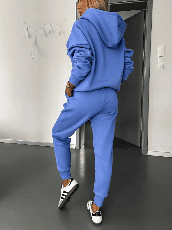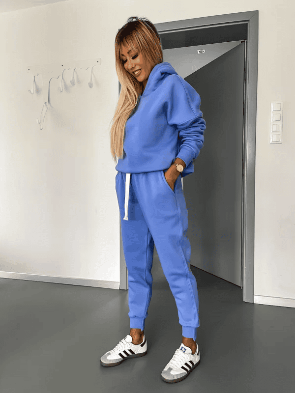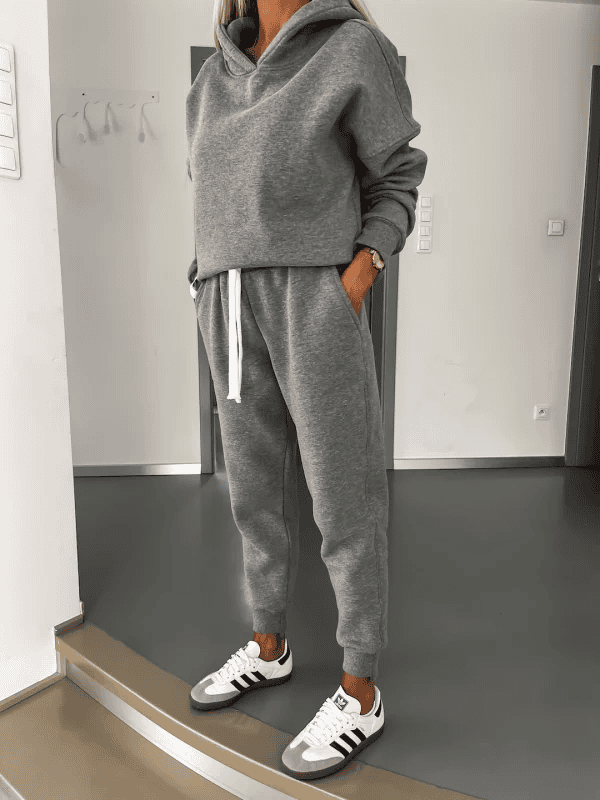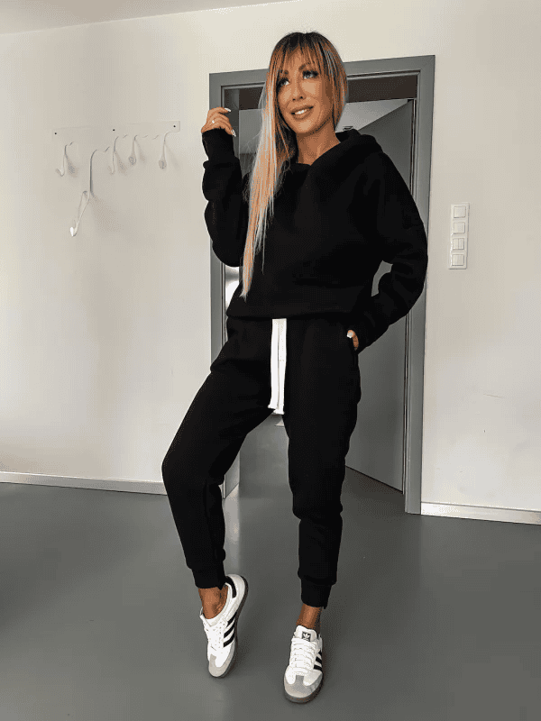 Dette sweatsæt er det perfekte valg til både afslapning og aktive dage. Hættetrøjen har en afslappet pasform med ribkanter, mens bukserne har en justerbar talje med snøre og elastiske manchetter. Sættet er lavet af blødt, kraftigt materiale, der holder dig varm og komfortabel hele dagen – ideelt til både hjemmehygge og udendørsaktiviteter.