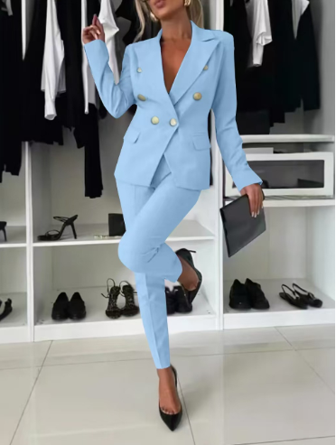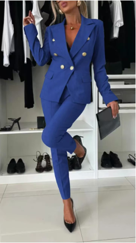 Dette stilfulde todelte sæt består af en skræddersyet blazer med dobbeltknappet lukning og elegante bukser, der skaber et sofistikeret look. Blazerens skarpe snit og dekorative knapper giver et eksklusivt udtryk, mens de slim-fit bukser fremhæver din silhuet. Perfekt til kontoret, forretningsmøder eller en aften i byen.