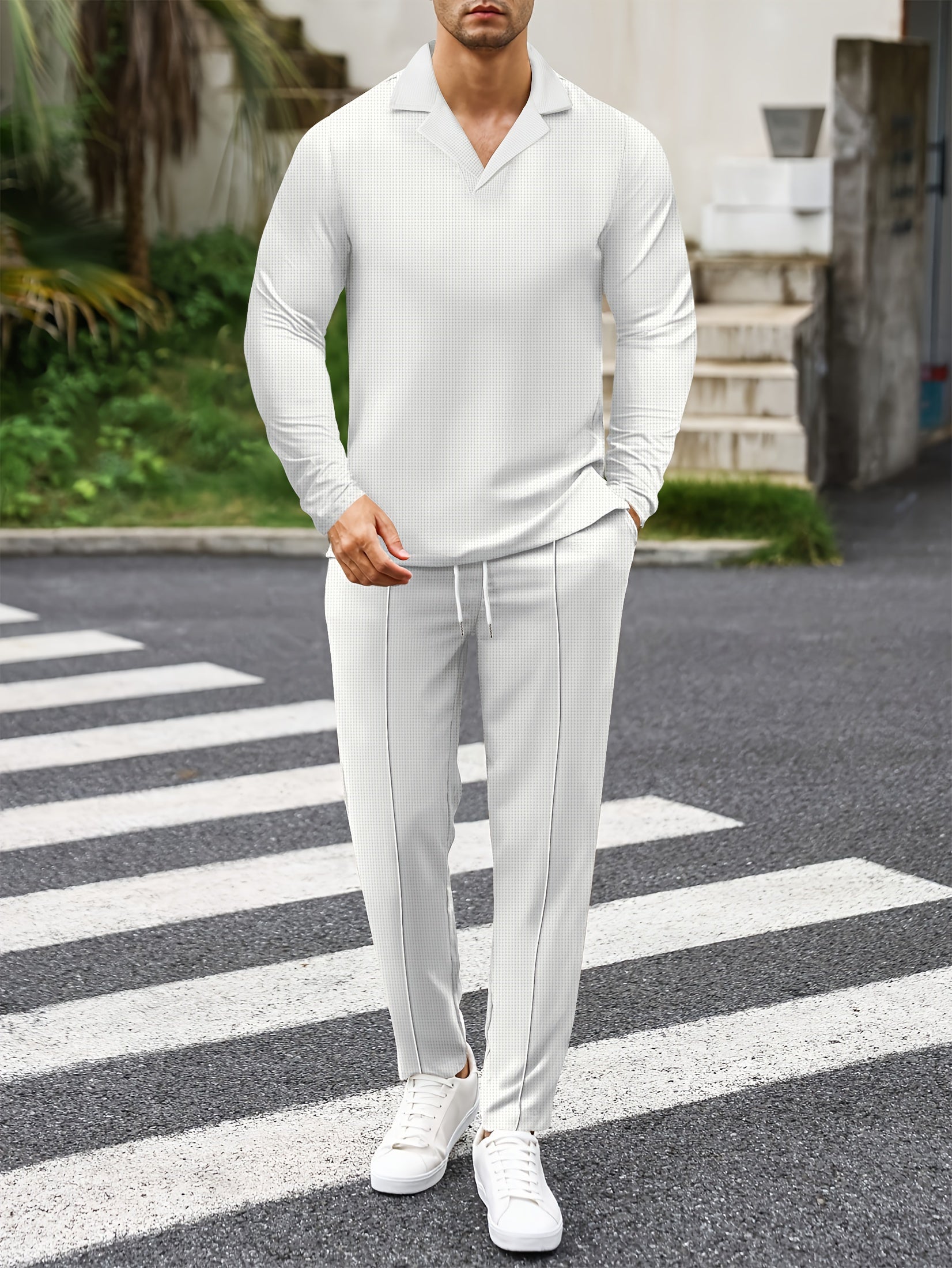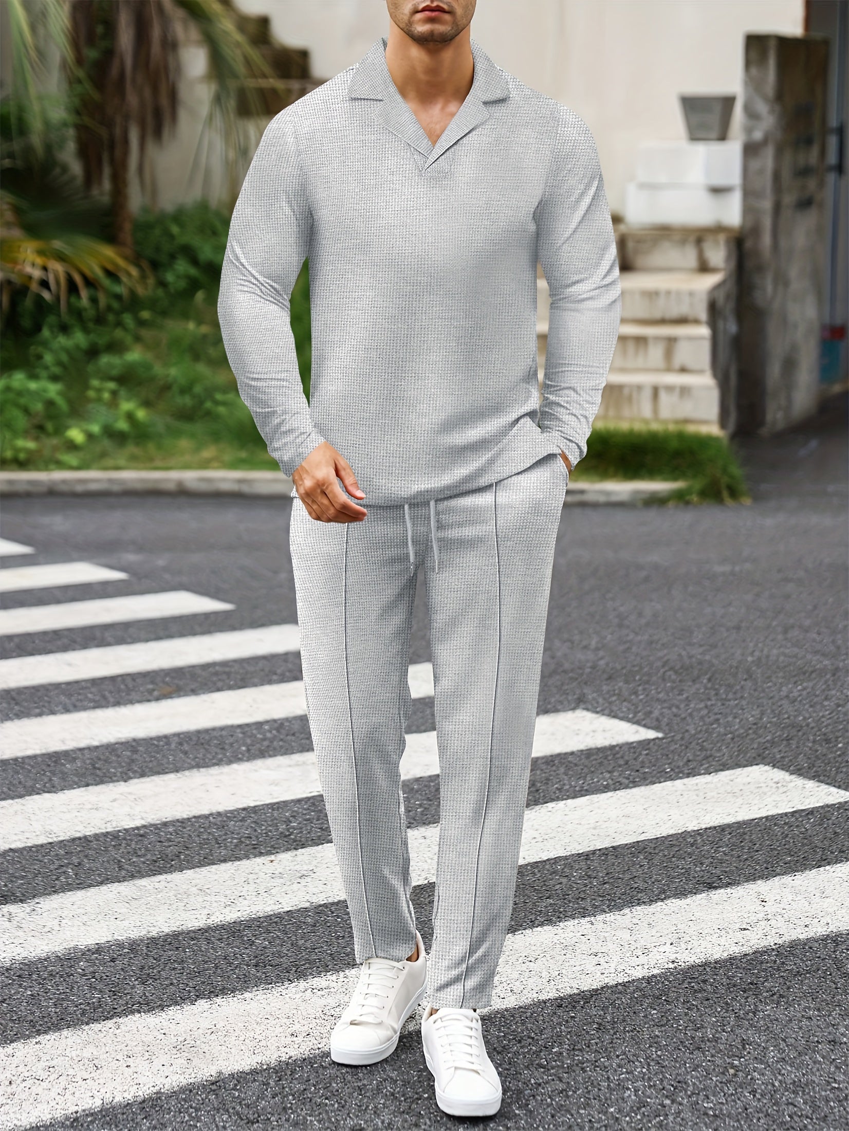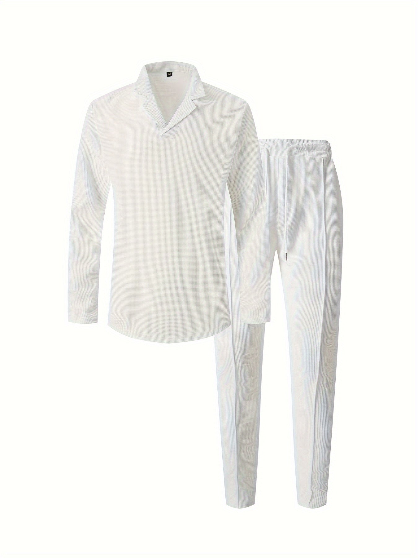 Dette todelte sæt består af en langærmet skjorte med åben krave og et par elastiske bukser med snøre, der tilsammen skaber et ubesværet og elegant look. Det let strukturerede materiale giver et moderne udtryk og gør sættet ideelt til både hjemmebrug, rejse eller casual udflugter. Komfort og stil går her hånd i hånd.