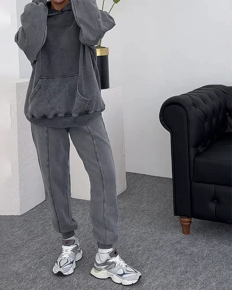 Dette to-delte sæt består af en oversized sweatshirt med kængurulomme og matchende bukser med elastiske ribkanter. Den let vasket finish giver et vintage-inspireret, cool look, mens den bløde kvalitet og afslappede pasform gør det ideelt til både hjemmebrug og casual streetwear.
