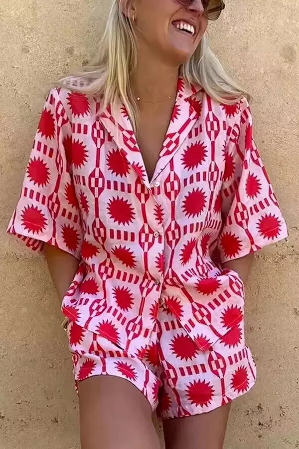 Denne kortærmede playsuit kombinerer et iøjnefaldende geometrisk mønster med en afslappet pasform og praktisk knaplukning foran. Den elastiske talje skaber en feminin silhuet uden at gå på kompromis med komforten. Perfekt til stranddage, ferier eller som et frisk hverdagslook i solskin.
