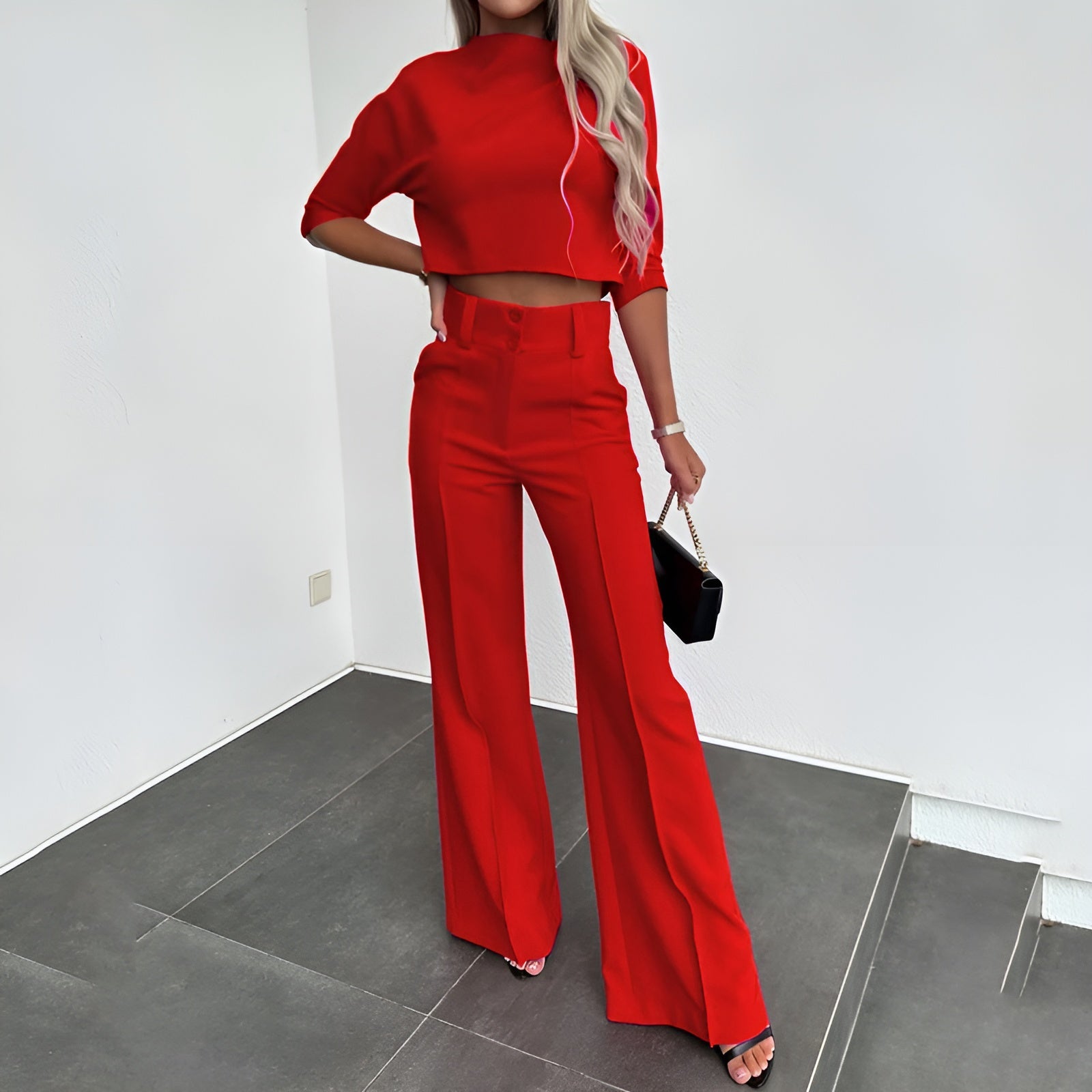 Dette sofistikerede todelte sæt består af en cropped bluse med trekvartlange ærmer og et par elegante, vide bukser med høj talje. Kombinationen skaber et harmonisk og stilrent udtryk, der passer perfekt til både formelle arrangementer og stilfulde hverdagslooks. Det skræddersyede snit fremhæver figuren på smigrende vis og giver samtidig en følelse af frihed og elegance.