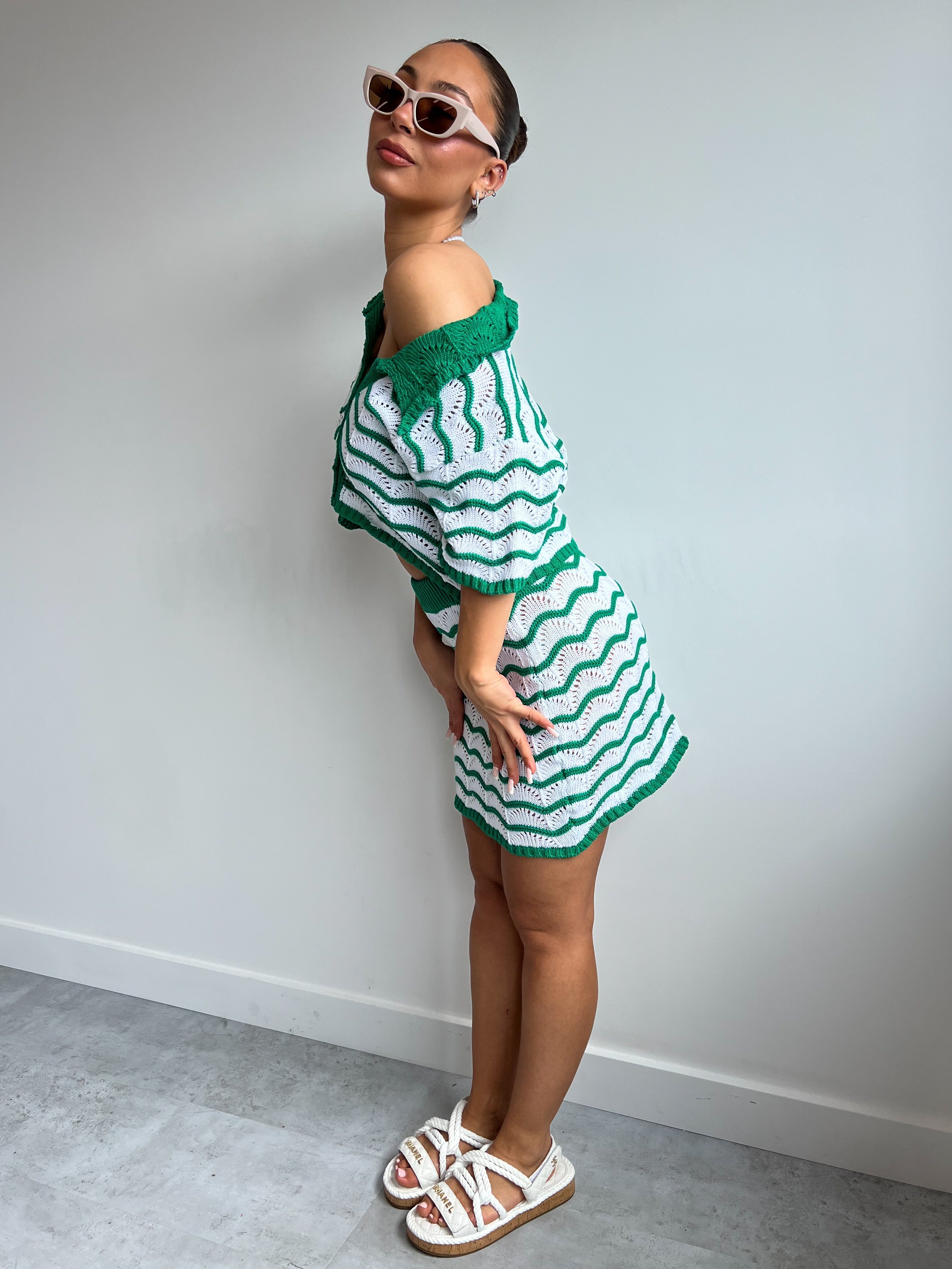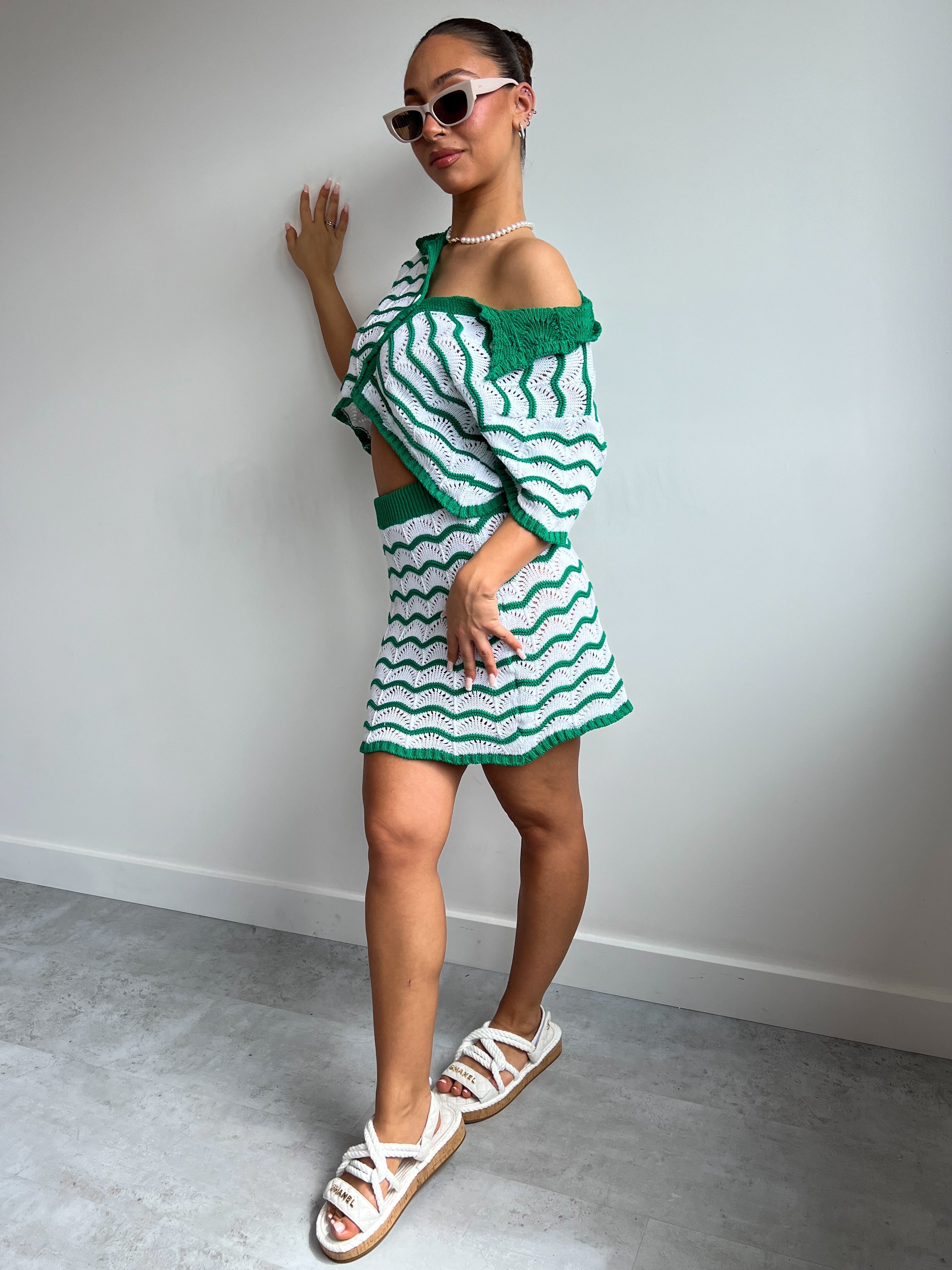 Gør en modeudtalelse med vores Bølgede Hæklesæt, der kombinerer elegance med et moderne touch. Dette sæt inkluderer en cropped top med knaplukning og en højtaljet mini-nederdel, begge lavet af let hæklet stof. De bølgede grønne og hvide mønstre tilføjer et legende og trendy element, perfekt til afslappede udflugter eller stranddage.