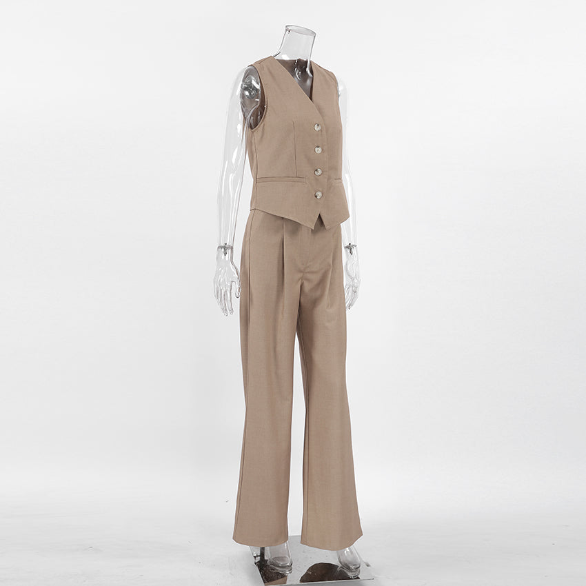 Dette sæt består af en ærmeløs knapvest med struktureret snit og højtaljede, vide bukser, der giver en stilfuld og sofistikeret silhuet. Det minimalistiske design og den diskrete elegance gør det ideelt til både arbejde, events og daglige outfits med et strejf af finesse.