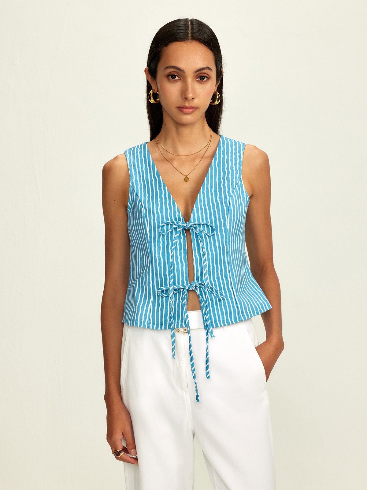 Denne ærmeløse top forener et legende udtryk med elegante detaljer. De to bindebånd foran skaber en åben, men raffineret effekt, mens det lette stof og de fine striber giver et luftigt look. Den dybe V-udskæring fremhæver halsen og gør toppen ideel til varme dage og solrige eventyr.