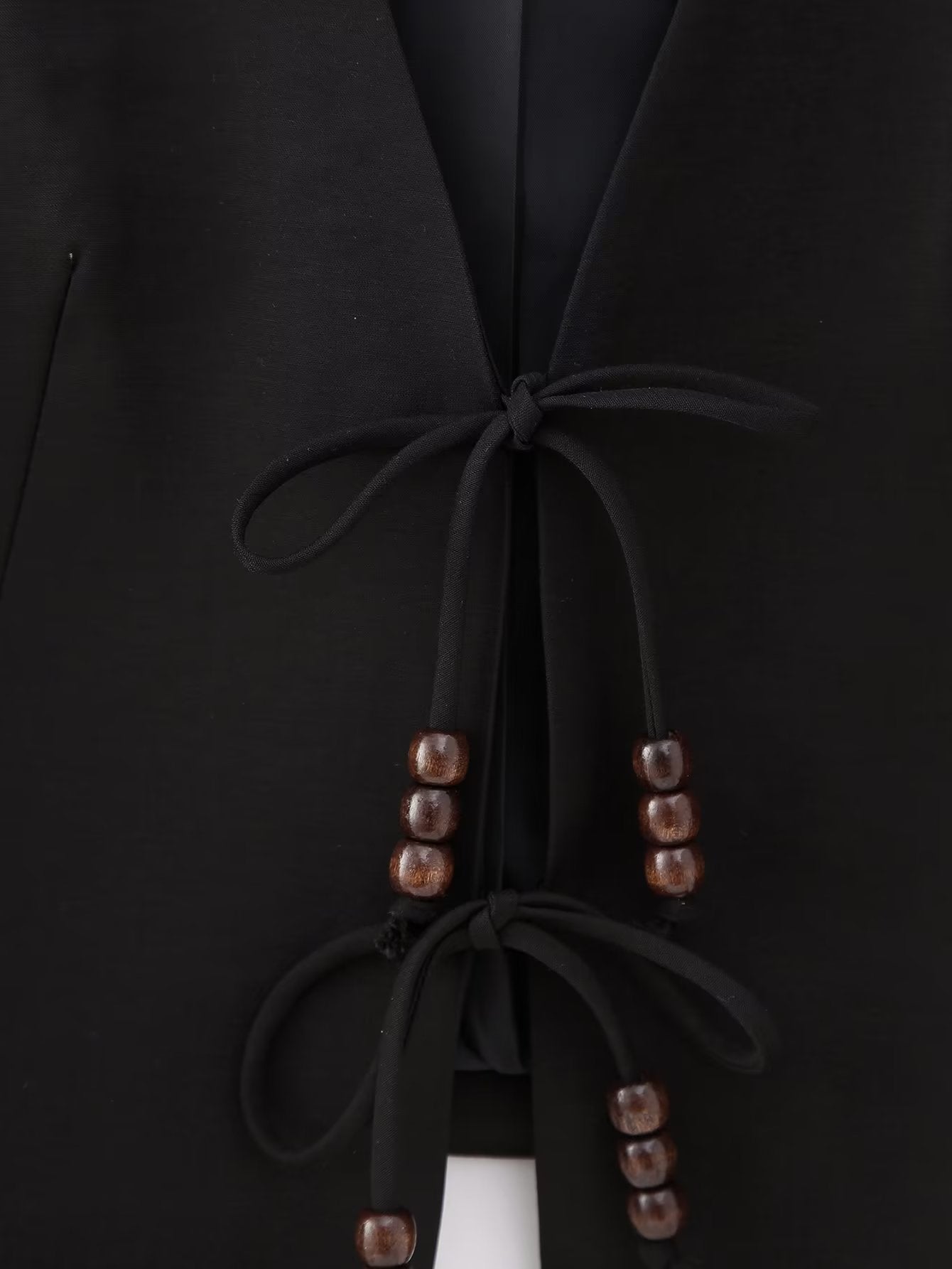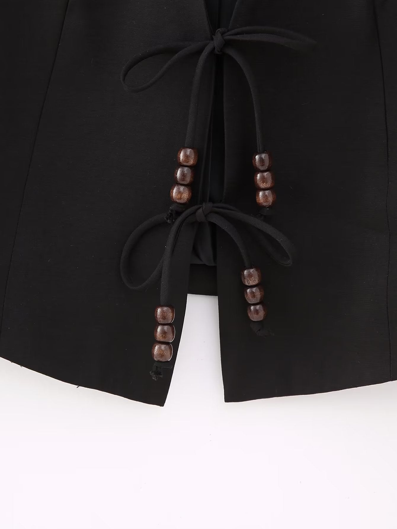 Denne ærmeløse vest er det perfekte valg til en raffineret og moderne garderobe. Den dybe V-udskæring og åbne front lukkes med bindebånd dekoreret med små, runde perler, som tilføjer et diskret bohemepræg. Den skarpe, figurskårne pasform og rene linjer gør den ideel både til afslappede og formelle stylinger.