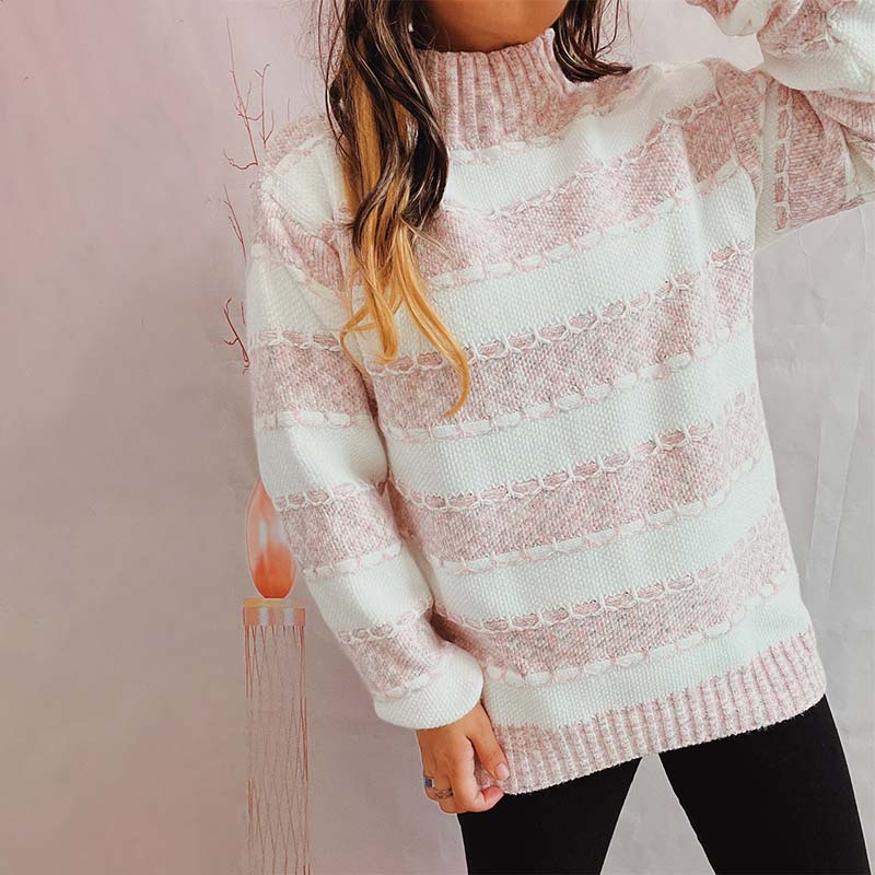 Denne hyggelige striktrøje byder på et blødt og afslappet fit med markante striber og en høj ribkrave, som giver ekstra varme og stil. Det delikate mønster i striberne skaber en let tekstur og et elegant spil i designet. Perfekt til hyggelige dage og kolde måneder, hvor komfort og æstetik går hånd i hånd.