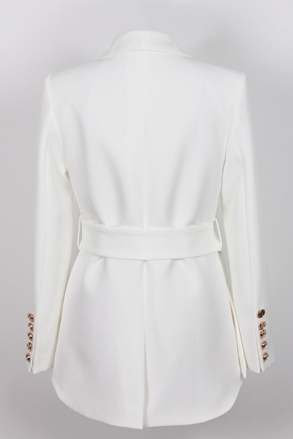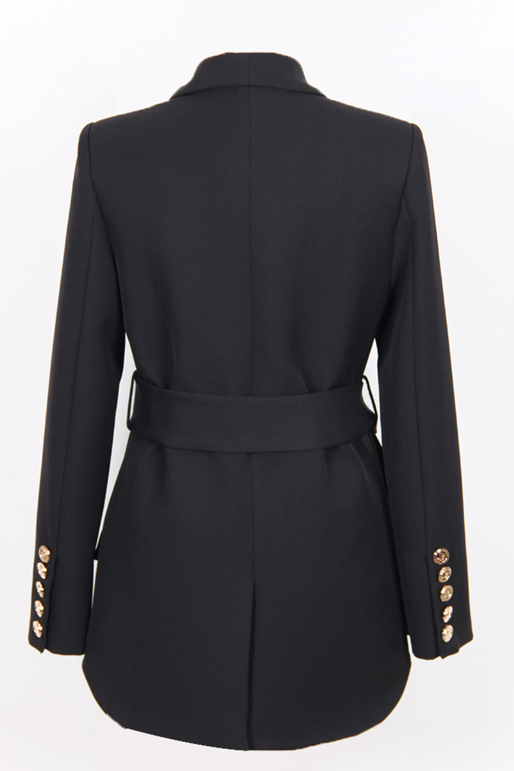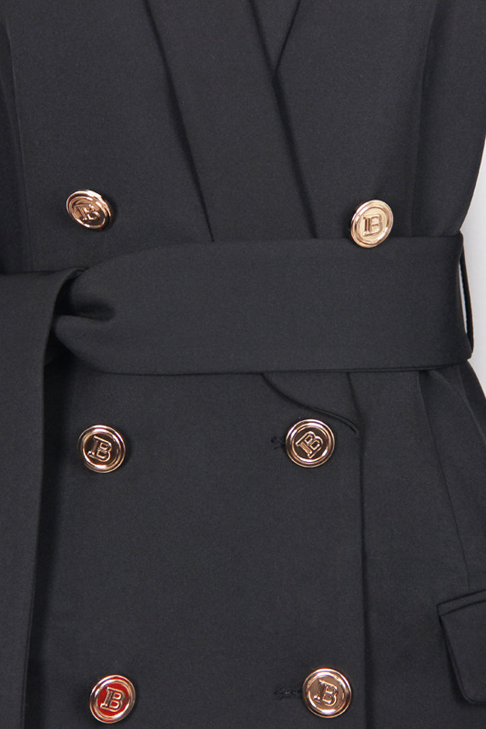 Denne blazer har en flatterende, taljefremhævende pasform takket være det brede bælte og den dobbeltradede lukning. De dekorative knapper giver en luksuriøs finish, mens det rene design og den bløde struktur gør den ideel til både professionelle og festlige anledninger. Et tidløst valg med moderne kant.