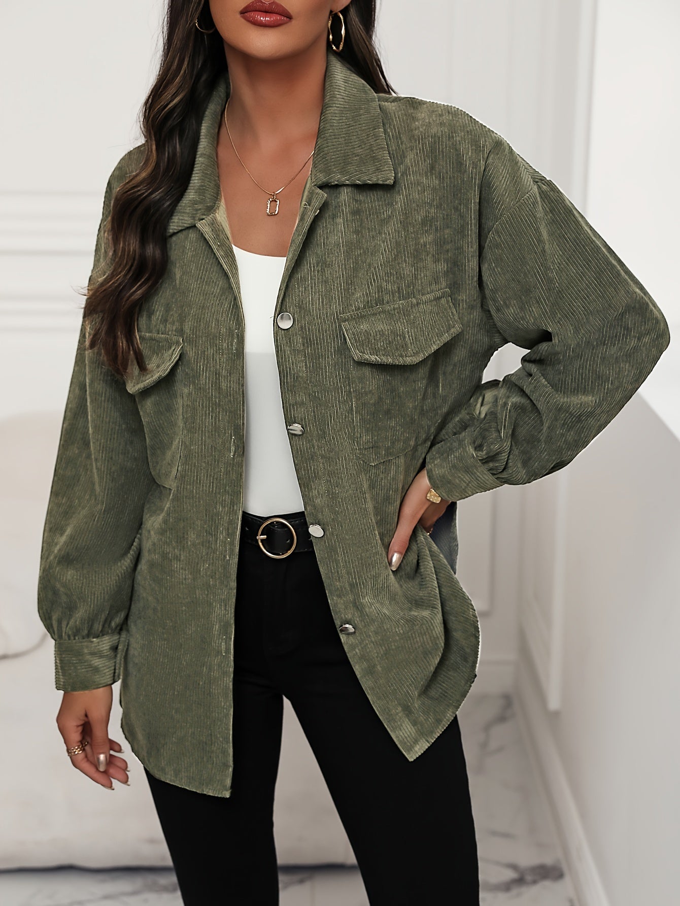 Denne fløjls-skjortejakke er perfekt til både lag-på-lag styling og selvstændigt brug. Det bløde, rillede stof føles lækkert mod huden og tilføjer et sofistikeret touch til enhver hverdagsgarderobe. Med trykknapper og brystlommer får du både funktion og flair i én og samme jakke.