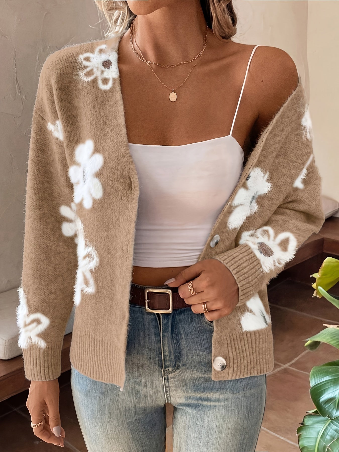 Denne hyggelige cardigan med blomsterdetaljer er den perfekte kombination af sødme og stil. Den dybe V-udskæring og dekorative knapper skaber et flatterende look, mens det børstede strikmateriale giver varme og komfort. Ideel til både afslappede dage og når du vil tilføje et romantisk touch til dit outfit.