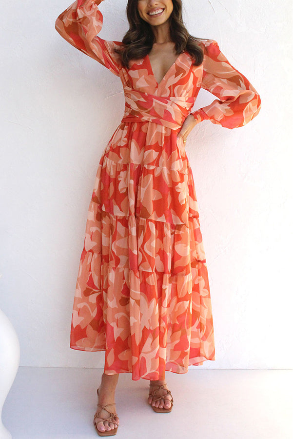 Denne maxikjole med blomsterprint er et ægte blikfang, skabt til særlige lejligheder og solrige dage. Det lette chiffonmateriale falder i smukke lag og bevæger sig yndefuldt med hvert skridt. Den markerede talje fremhæver figuren, mens V-udskæringen og de lange, let transparente ærmer skaber balance og raffinement. En ideel kjole til bryllupper, haveselskaber eller elegante middage.