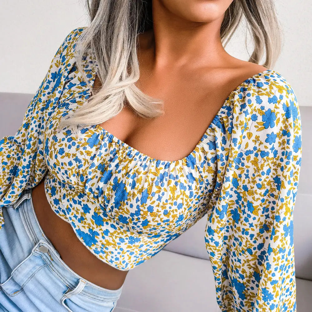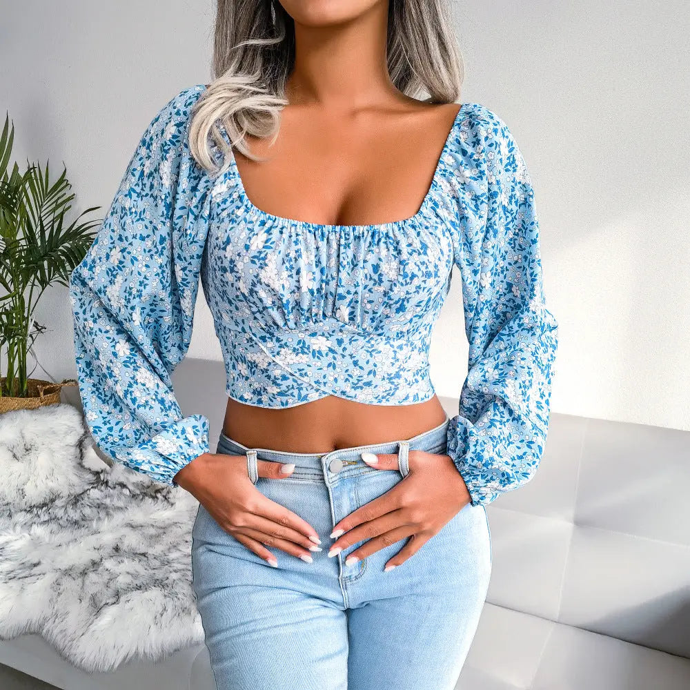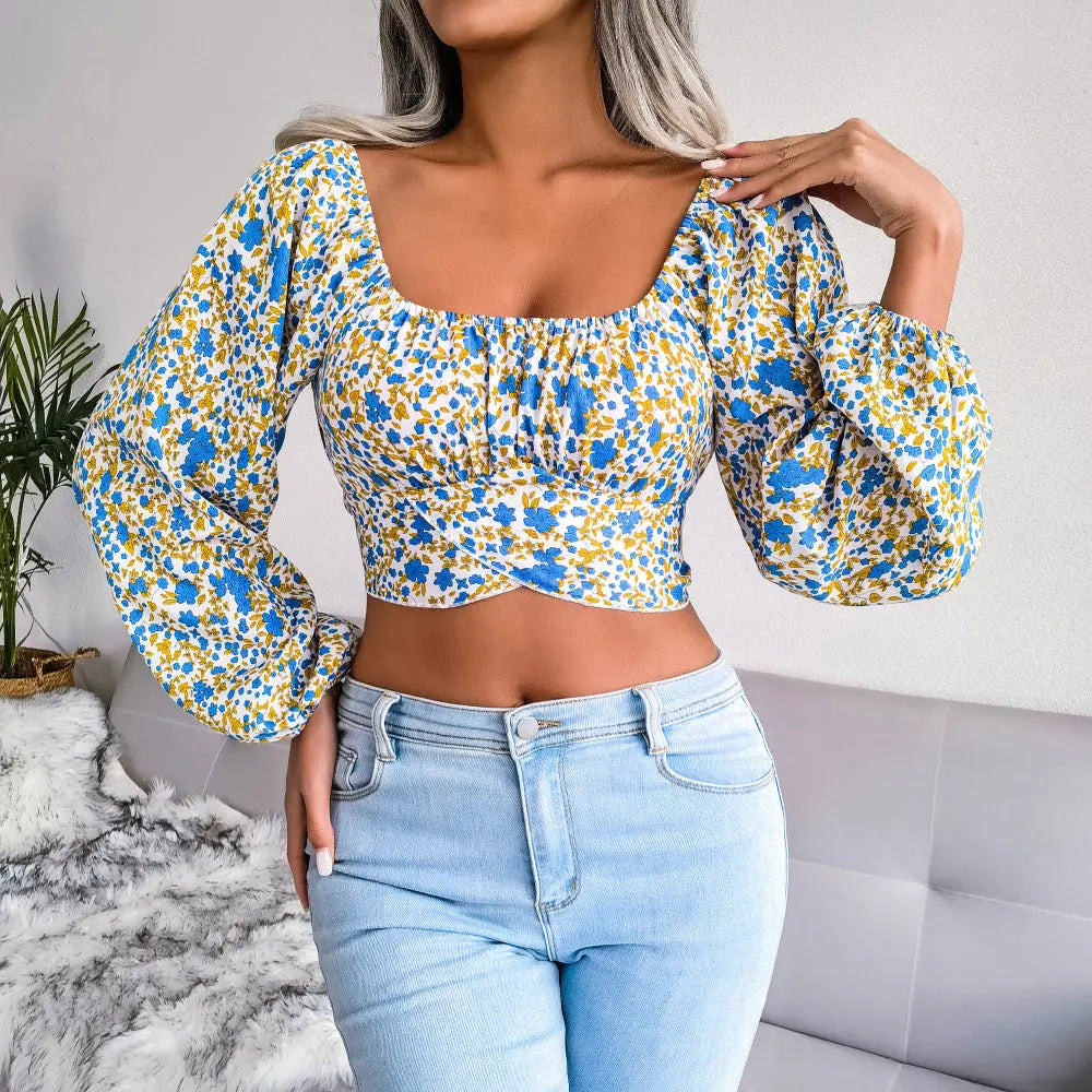 Denne korte bluse forener romantisk charme med moderne snit. De voluminøse lanterneærmer og det blomstrede mønster tilfører et legende, sommerligt udtryk, mens den elastiske rynkning foran giver en flatterende pasform. Den bølgede kant og firkantede udskæring fremhæver halsudskæringen og taljen – perfekt til alt fra stranddage til byvandring.