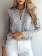 Denne bluse er fremstillet i raffineret blondestof, der tilføjer et sofistikeret og romantisk udtryk. De diskrete perleknapper og den bølgede blondekant skaber et yndefuldt design, som både føles let og luksuriøst. Med lange ærmer og gennembrudt mønster er den perfekt til både formelle lejligheder og hverdagsluksus.