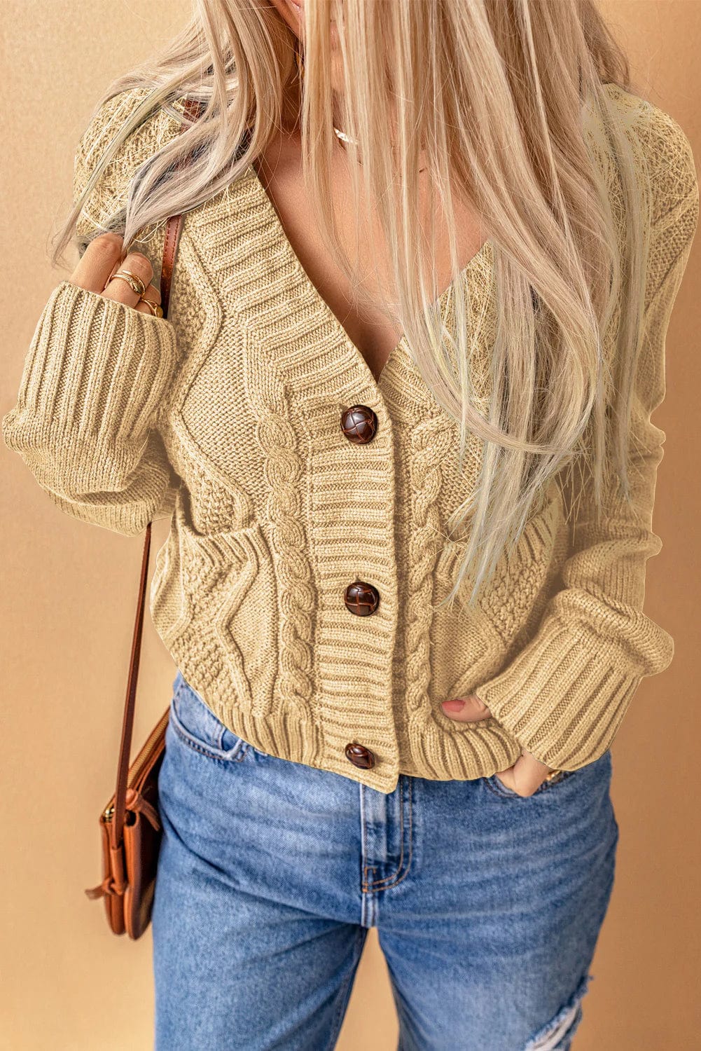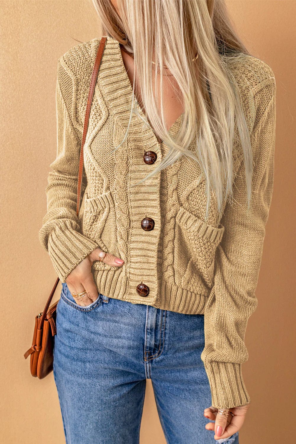 Denne hyggelige cardigan med kabelstrik og store knapper er det perfekte miks af vintageinspiration og nutidig komfort. De markante teksturer og brede ribkanter tilfører karakter, mens den dybe V-udskæring gør den alsidig til både hverdag og lag-på-lag styling. Et must-have til efterår og vinter.