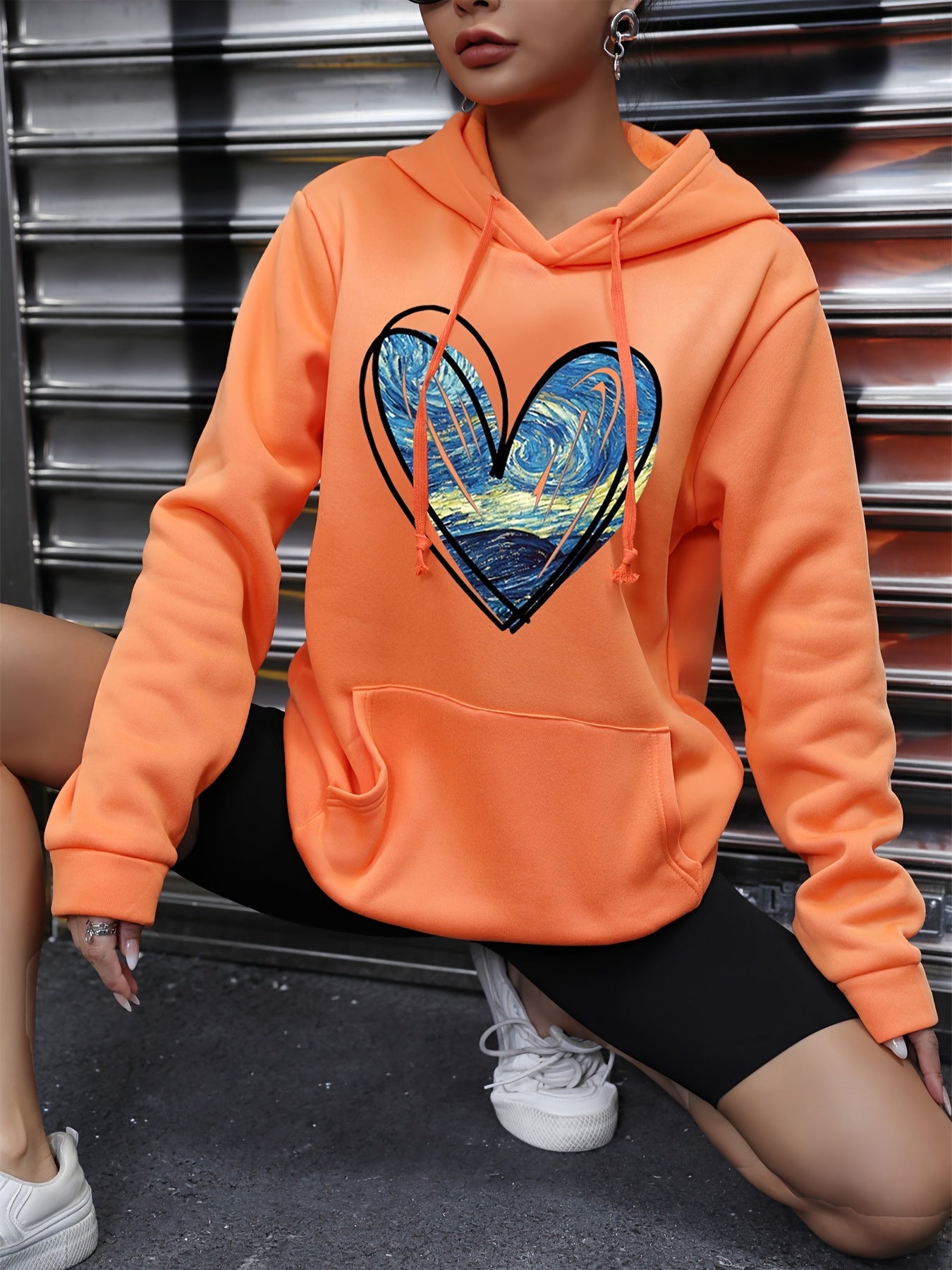 Denne unikke hættetrøje kombinerer afslappet hverdagsstil med et kunstnerisk twist. Det store hjerteprint på brystet indeholder et malerisk motiv, der minder om klassisk penselkunst – perfekt til dig, der ønsker at udtrykke kreativitet og varme på én gang. Trøjen er lavet i blødt sweatstof med hætte og rummelig kængurulomme for ekstra funktion og hygge.