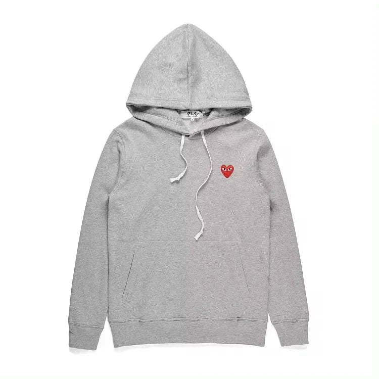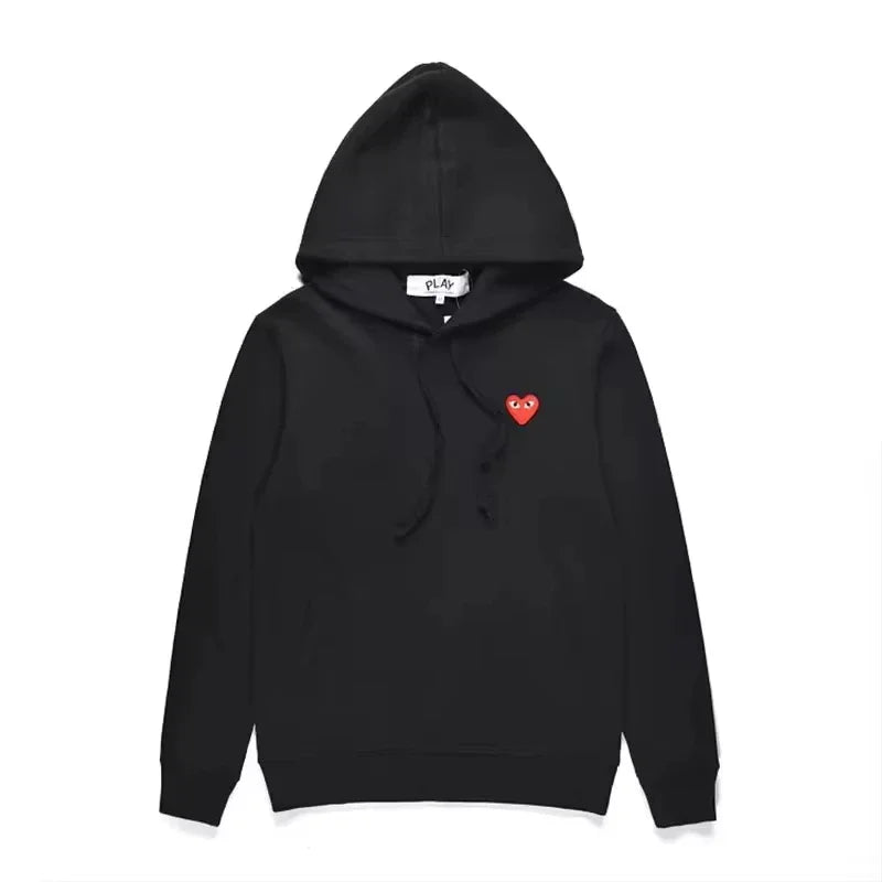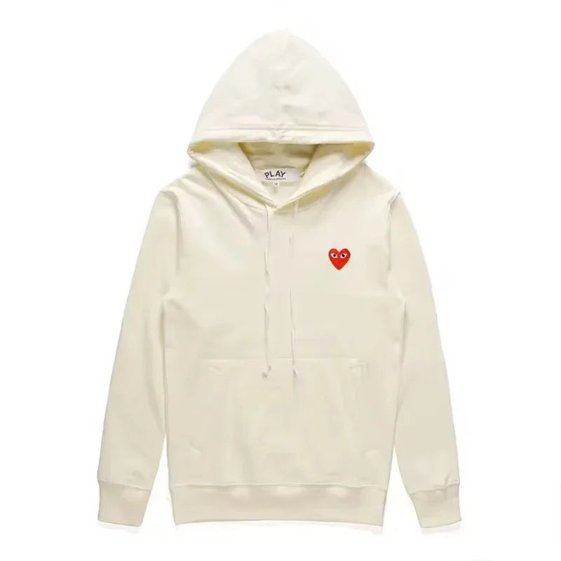 Denne klassiske hættetrøje kombinerer enkel designæstetik med et iøjnefaldende, broderet hjerte med øjne – en subtil, men effektfuld detalje, der giver karakter. Den bløde kvalitet og ribbede kanter sikrer komfort hele dagen, mens hætten med snøre giver et casual look, der passer til enhver afslappet garderobe.