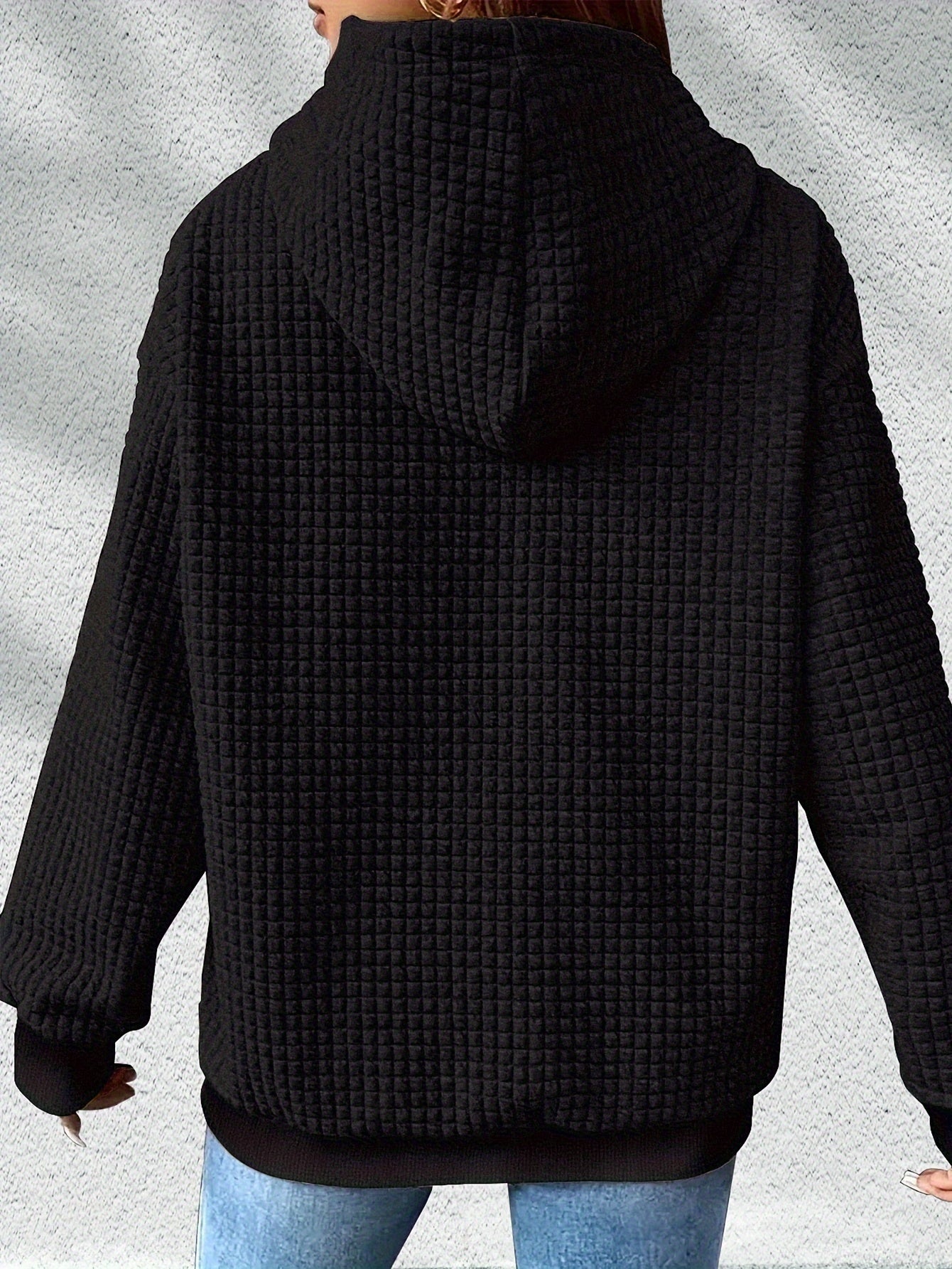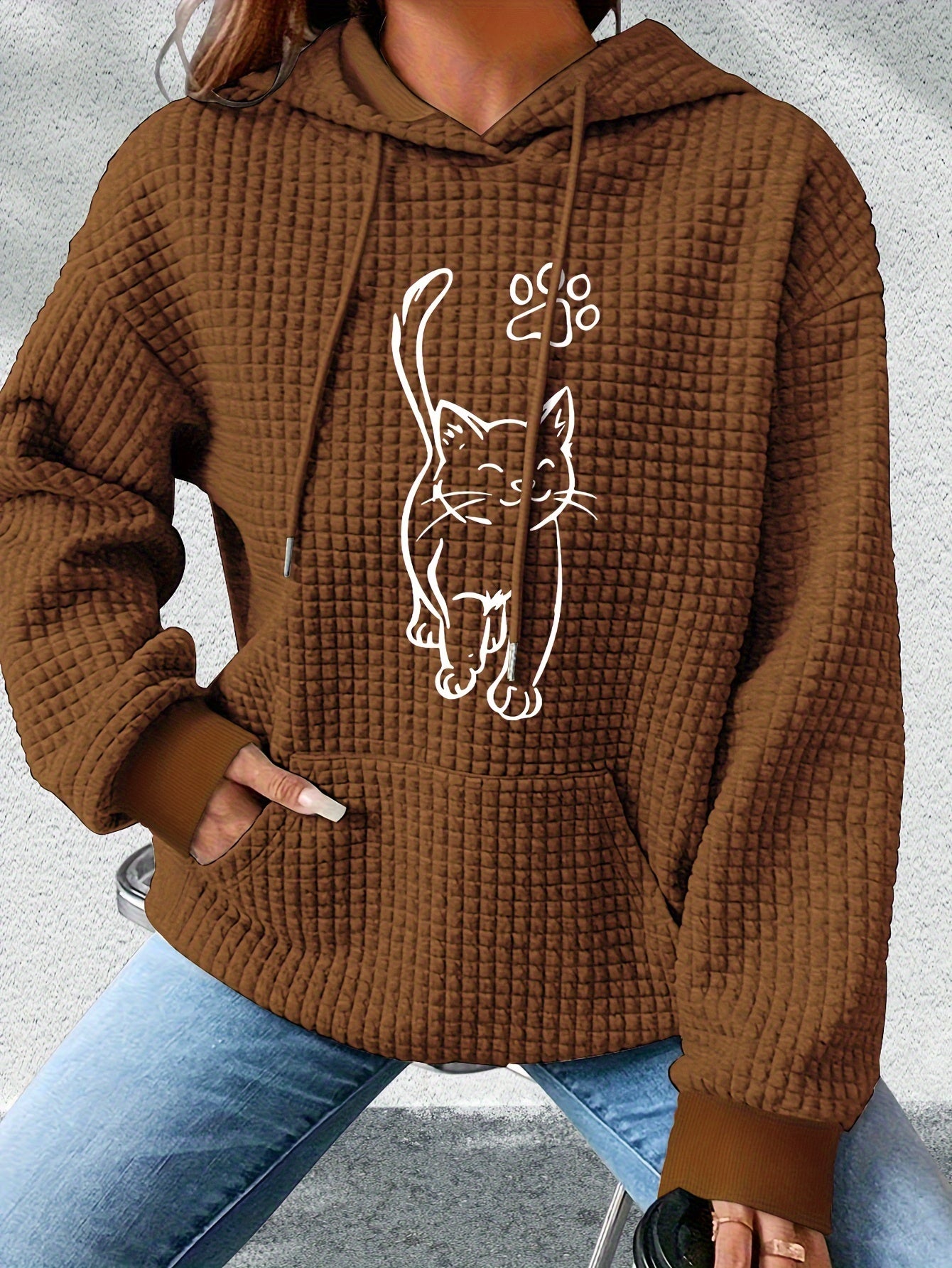 Denne hyggelige hættetrøje med sødt kattemotiv og potegrafik er perfekt til katteelskere, der vil udtrykke deres stil med et smil. Den quiltede vaffeltekstur tilføjer visuel dybde og varme, mens den rummelige hætte og kængurulomme gør den ideel til afslappede hverdage. Den bløde kvalitet gør den perfekt til både hjemlig hygge og udendørs komfort.
