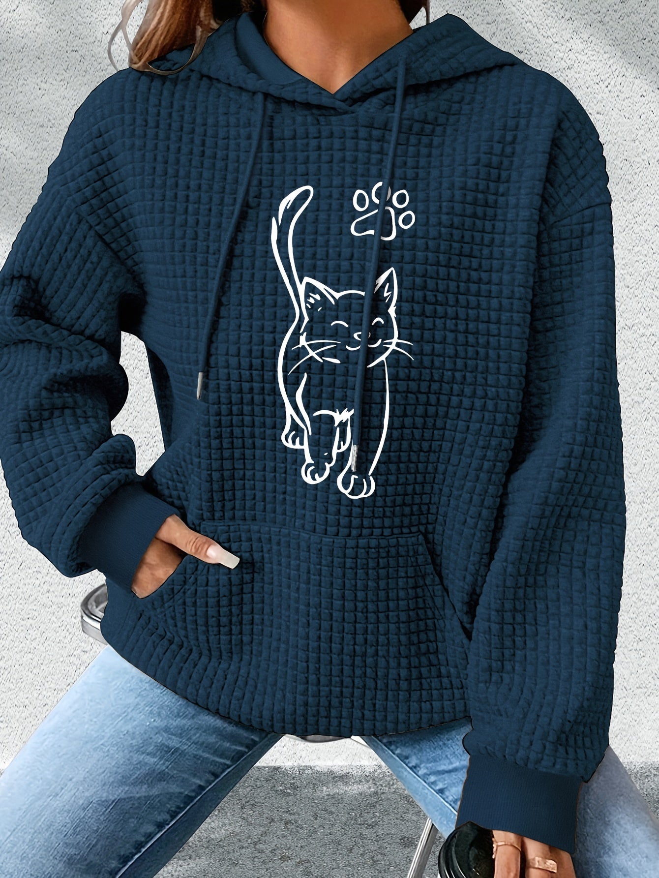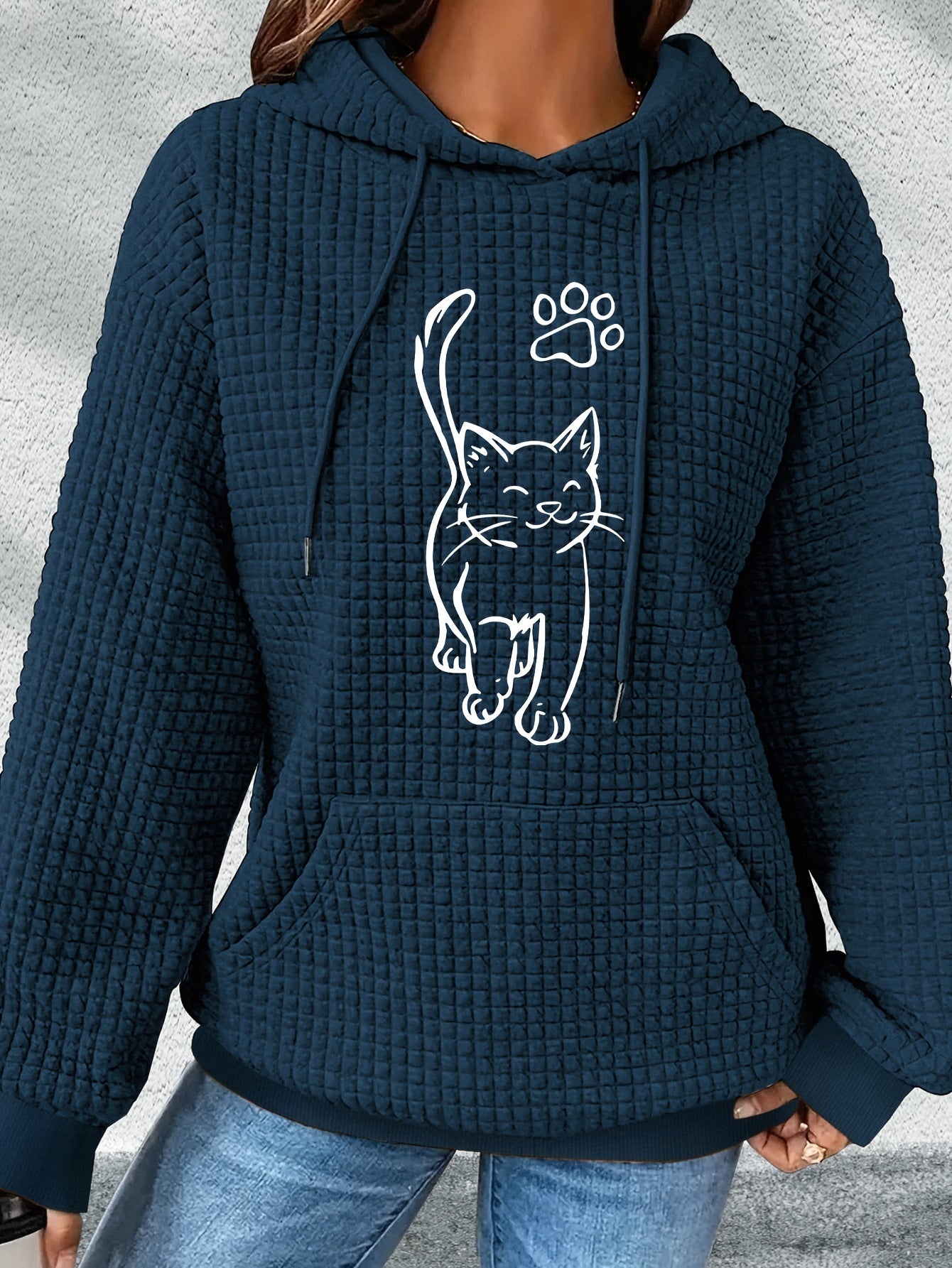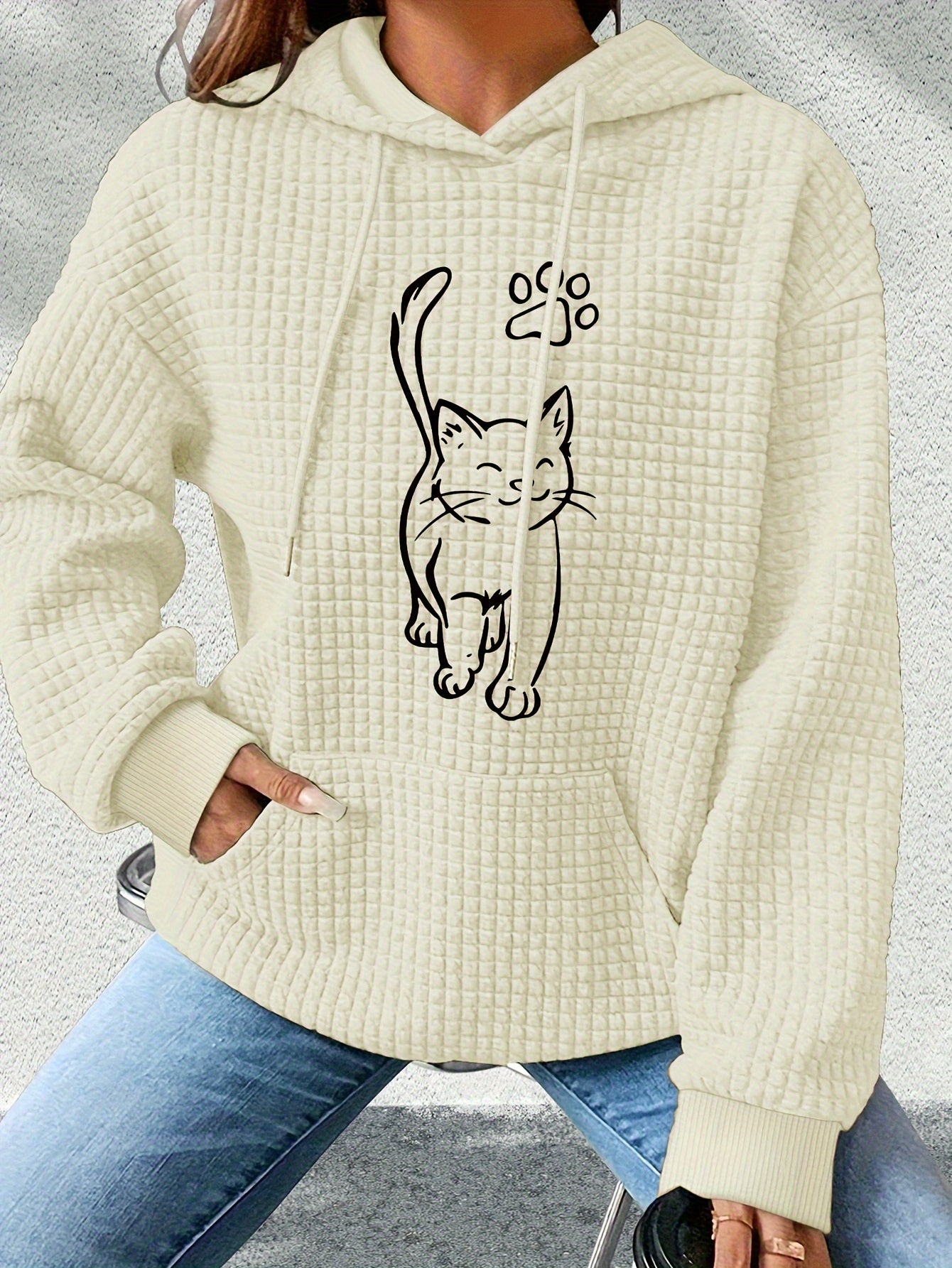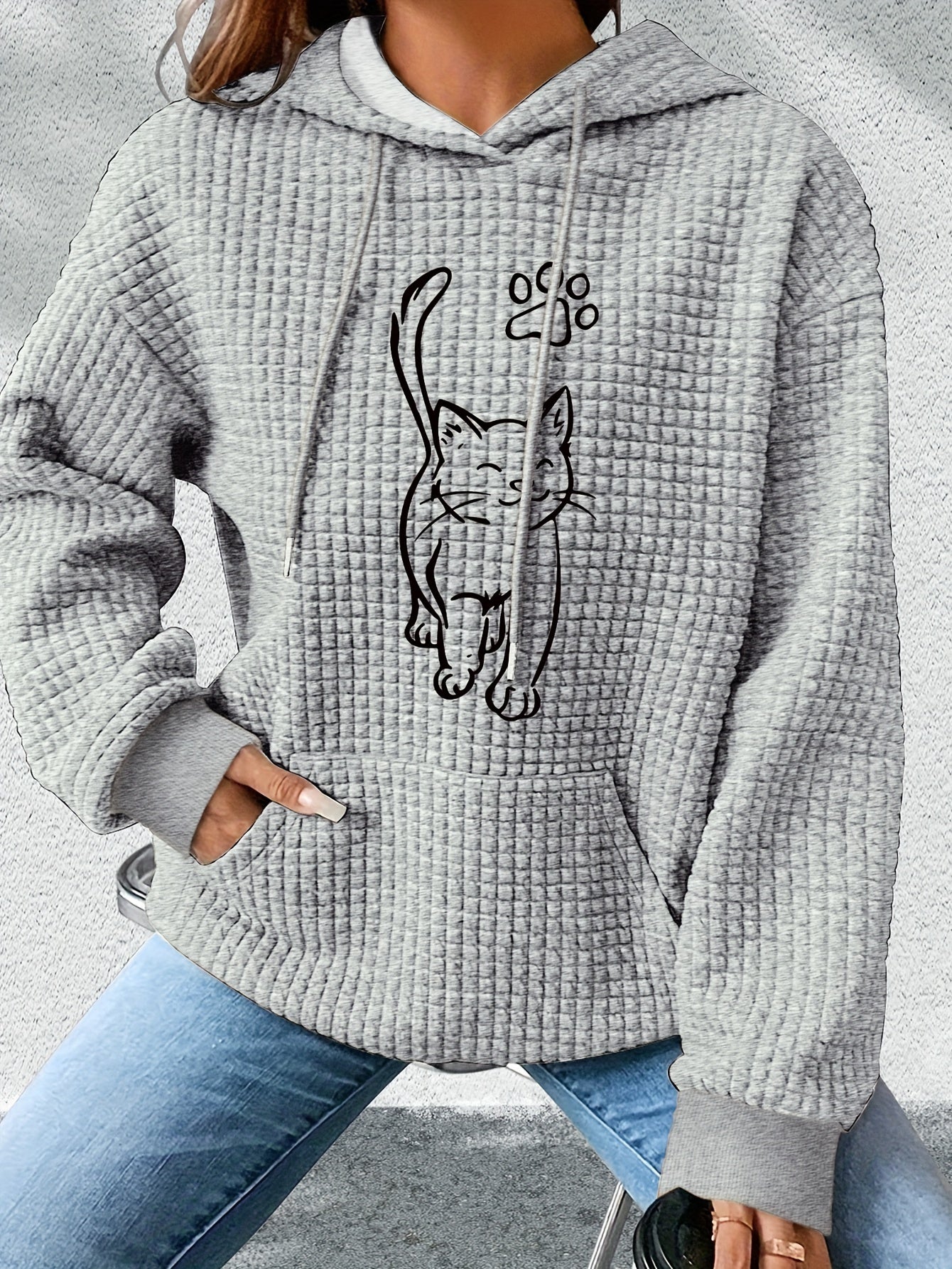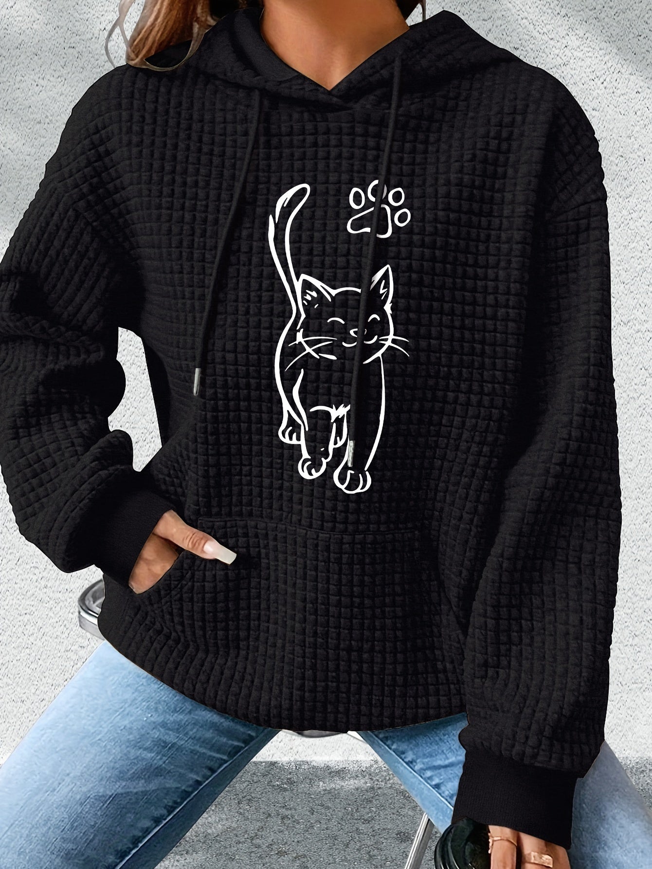Hættetrøje med Kat Print | Quiltet Tekstur | Komfortabel og Stilfuld