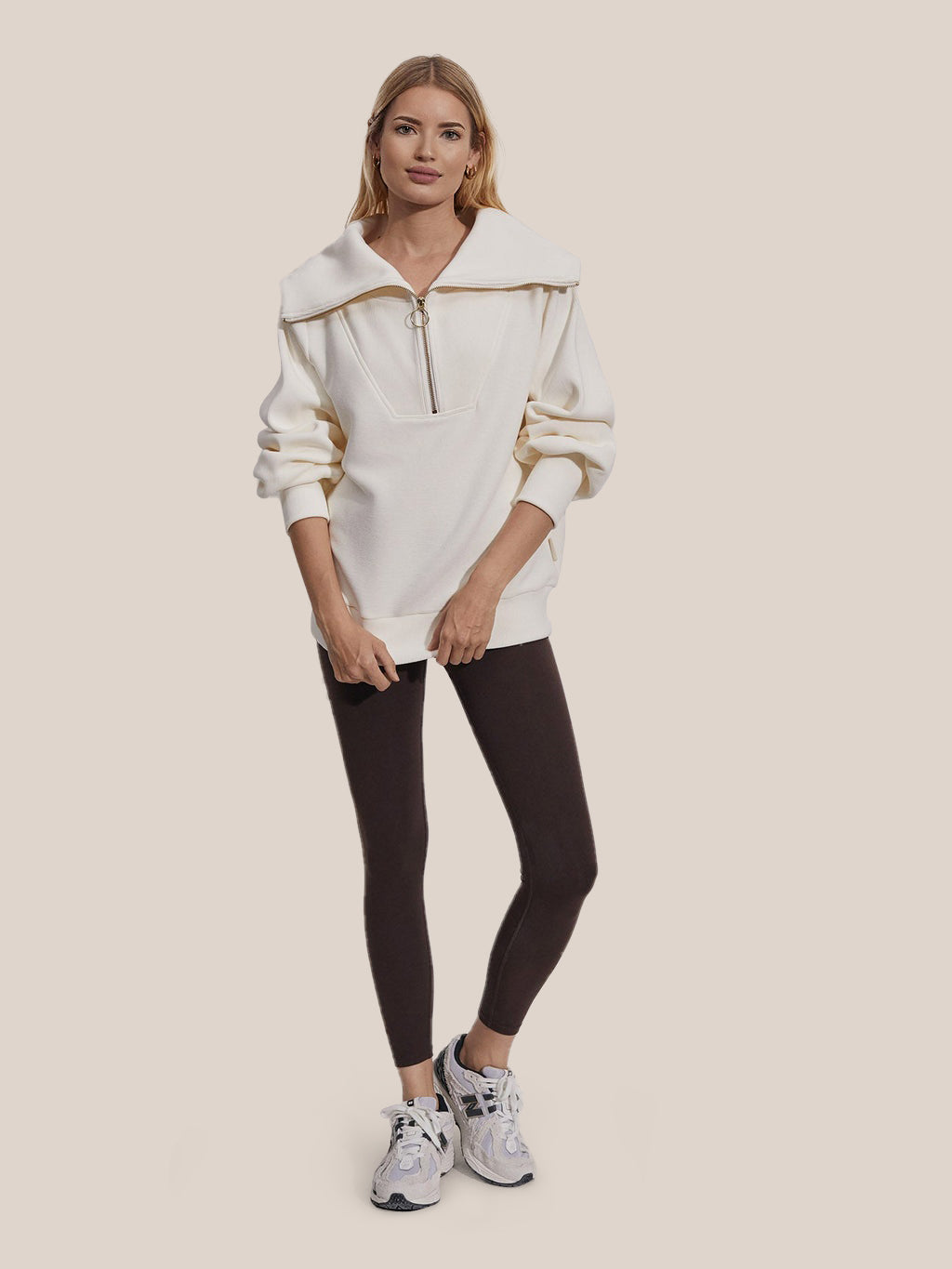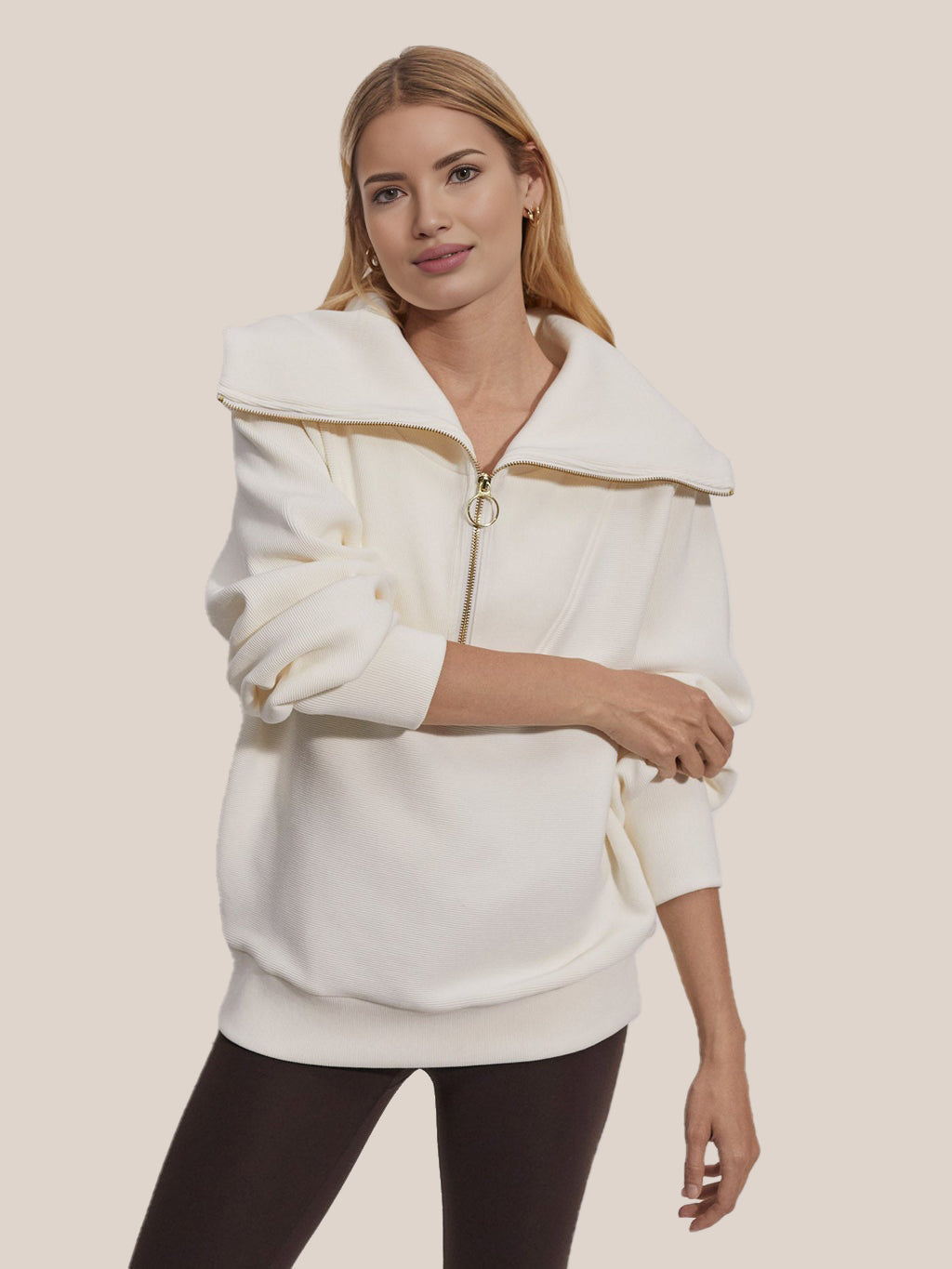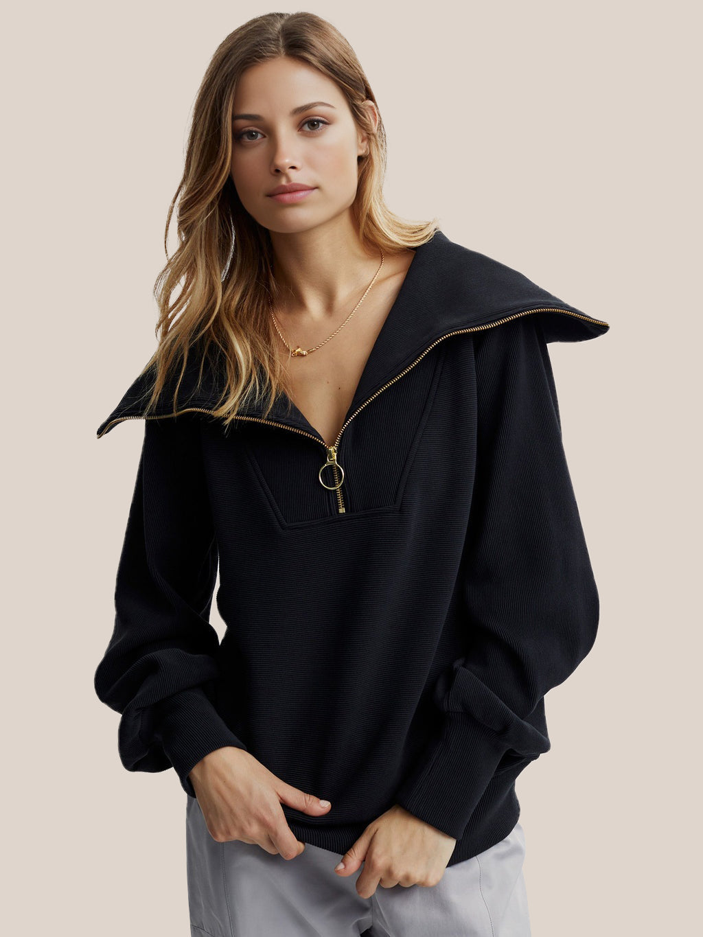Denne sweatshirt er ideel til hverdagsbrug med sit sporty udtryk og afslappede pasform. Den markante lynlås med ringtræk og den brede krave tilføjer et moderne twist, mens det bløde materiale sikrer en behagelig oplevelse hele dagen. Perfekt til både afslapning og aktive dage med et stilfuldt touch.