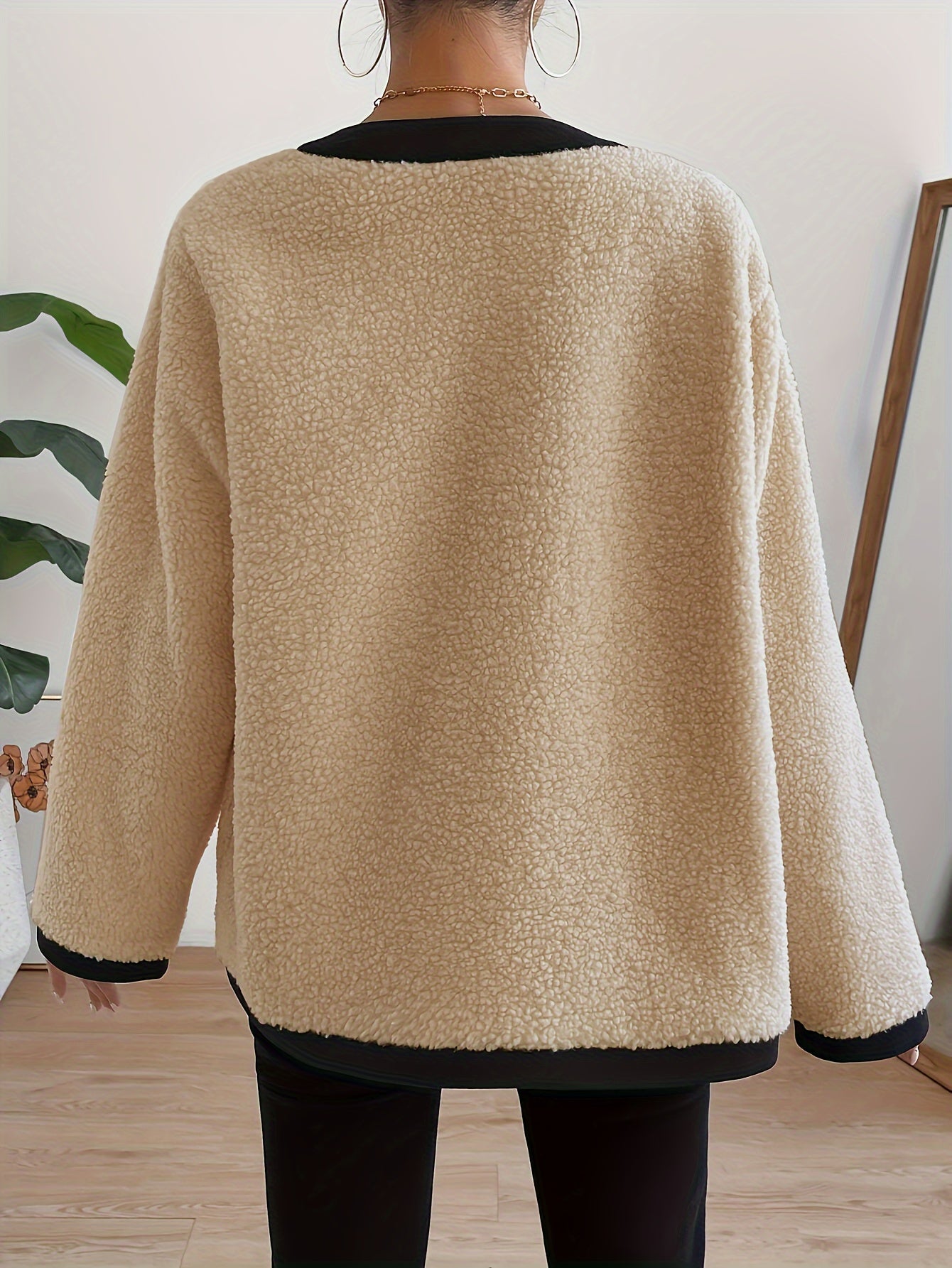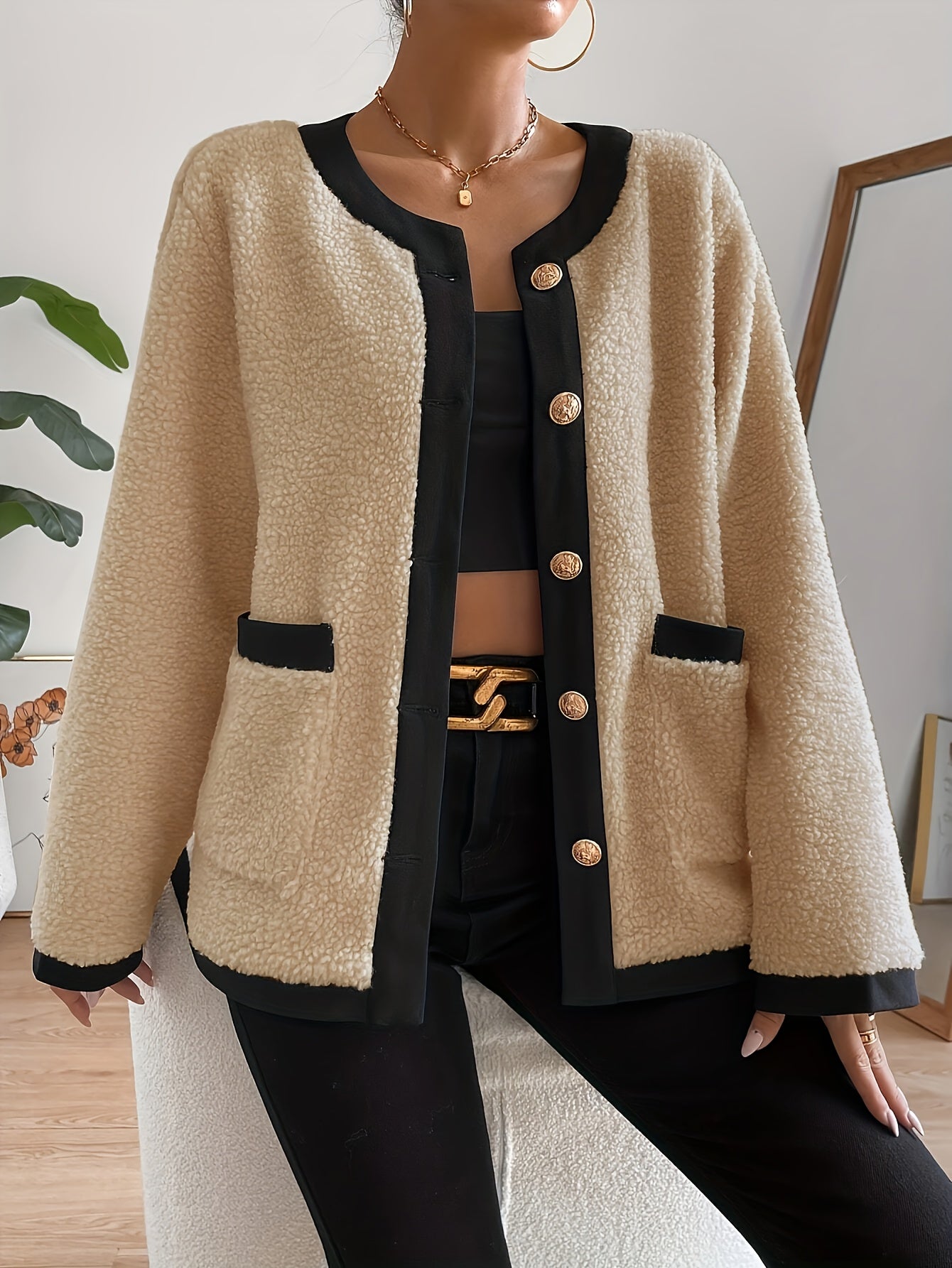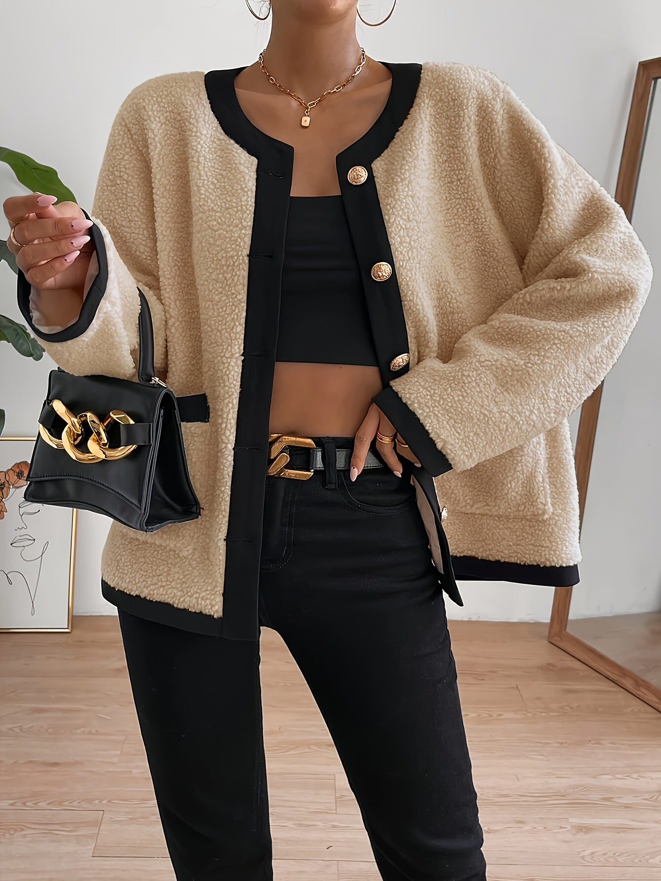 Denne teddyjakke fremstår eksklusiv med sine markante kontrastkanter og dekorative knapper. Den boxy pasform og det bløde materiale skaber en behagelig balance mellem struktur og komfort, mens de elegante detaljer giver et luksuriøst touch. Perfekt til både hverdagsbrug og aftener, hvor stilen gerne må være i fokus.