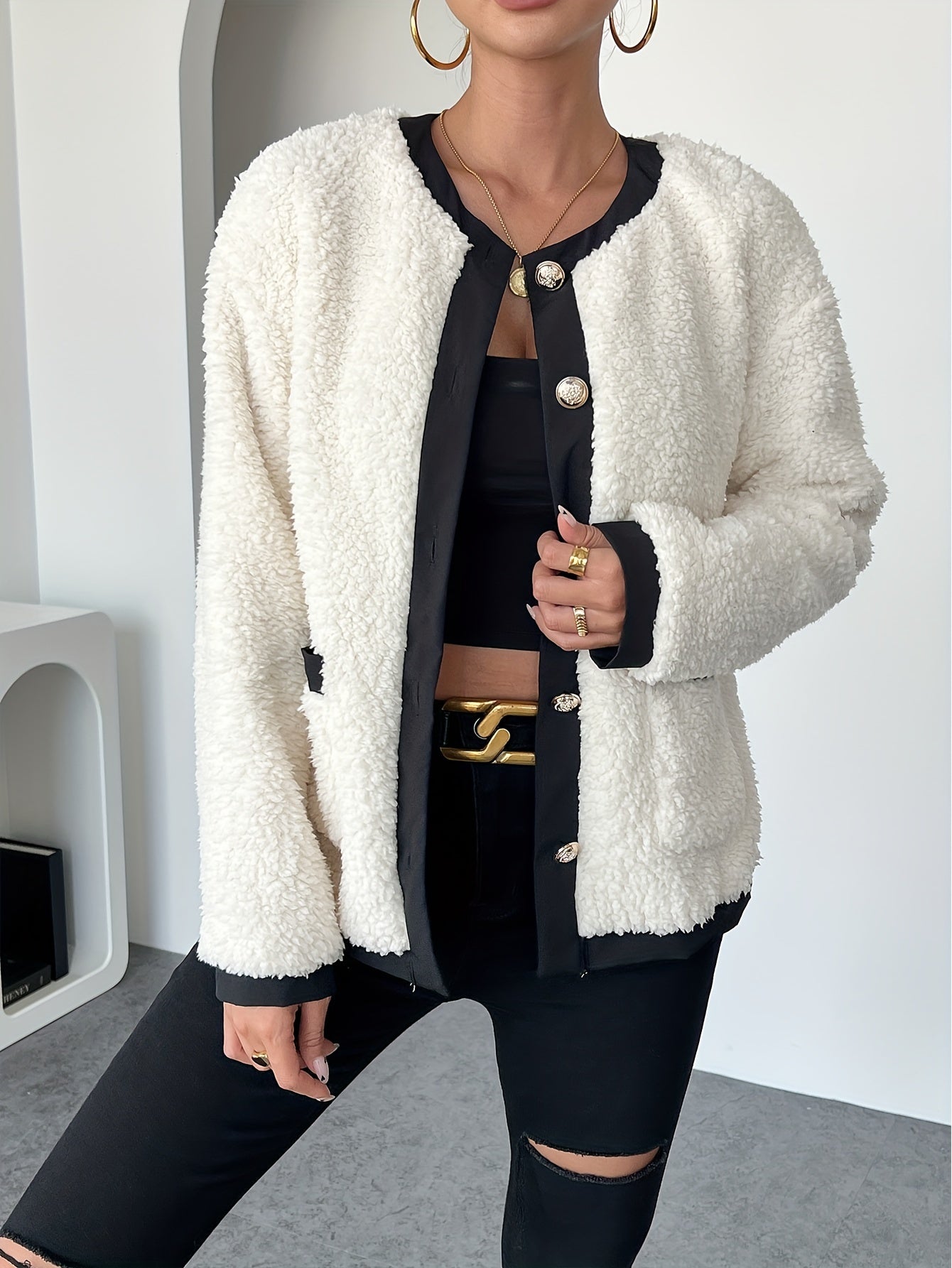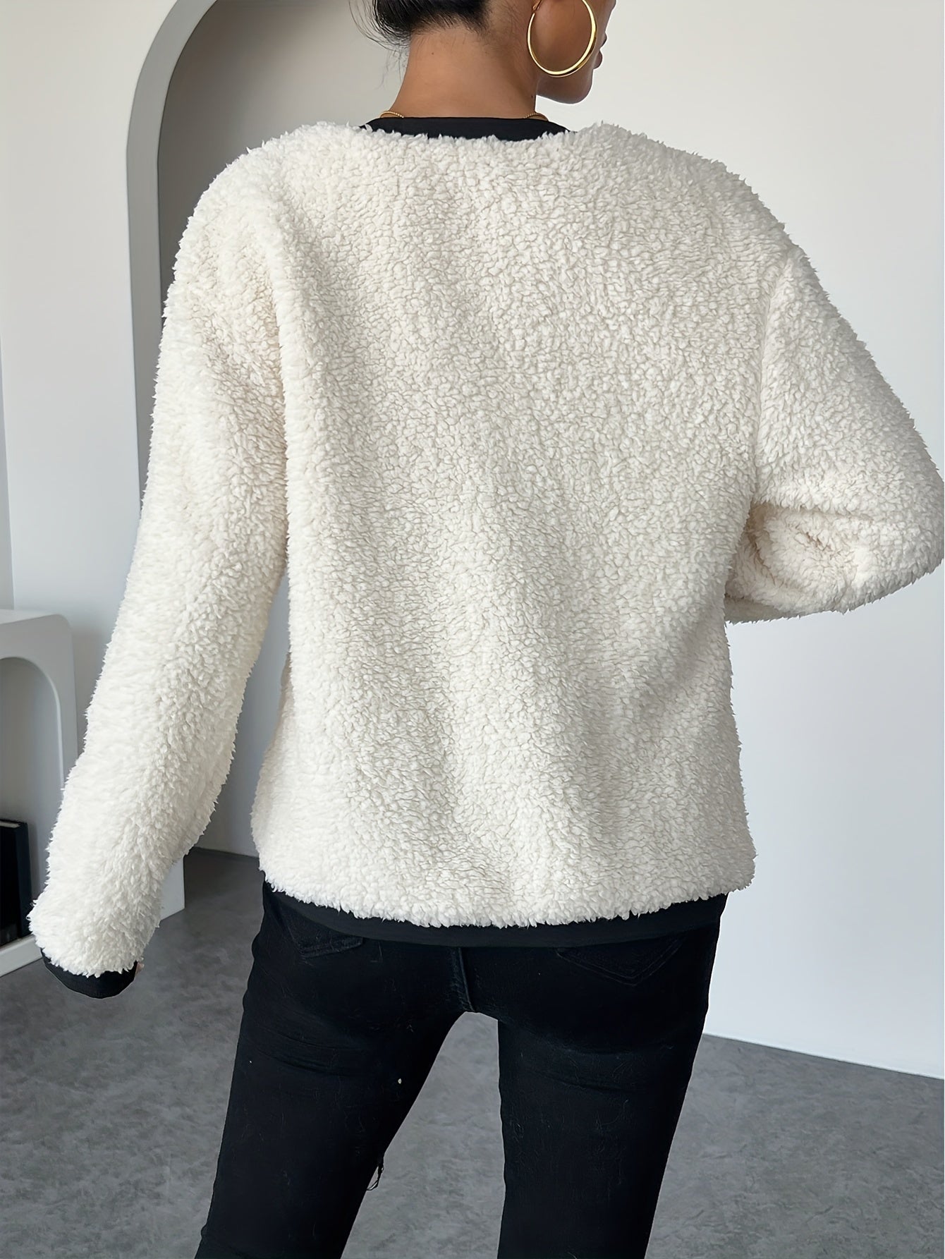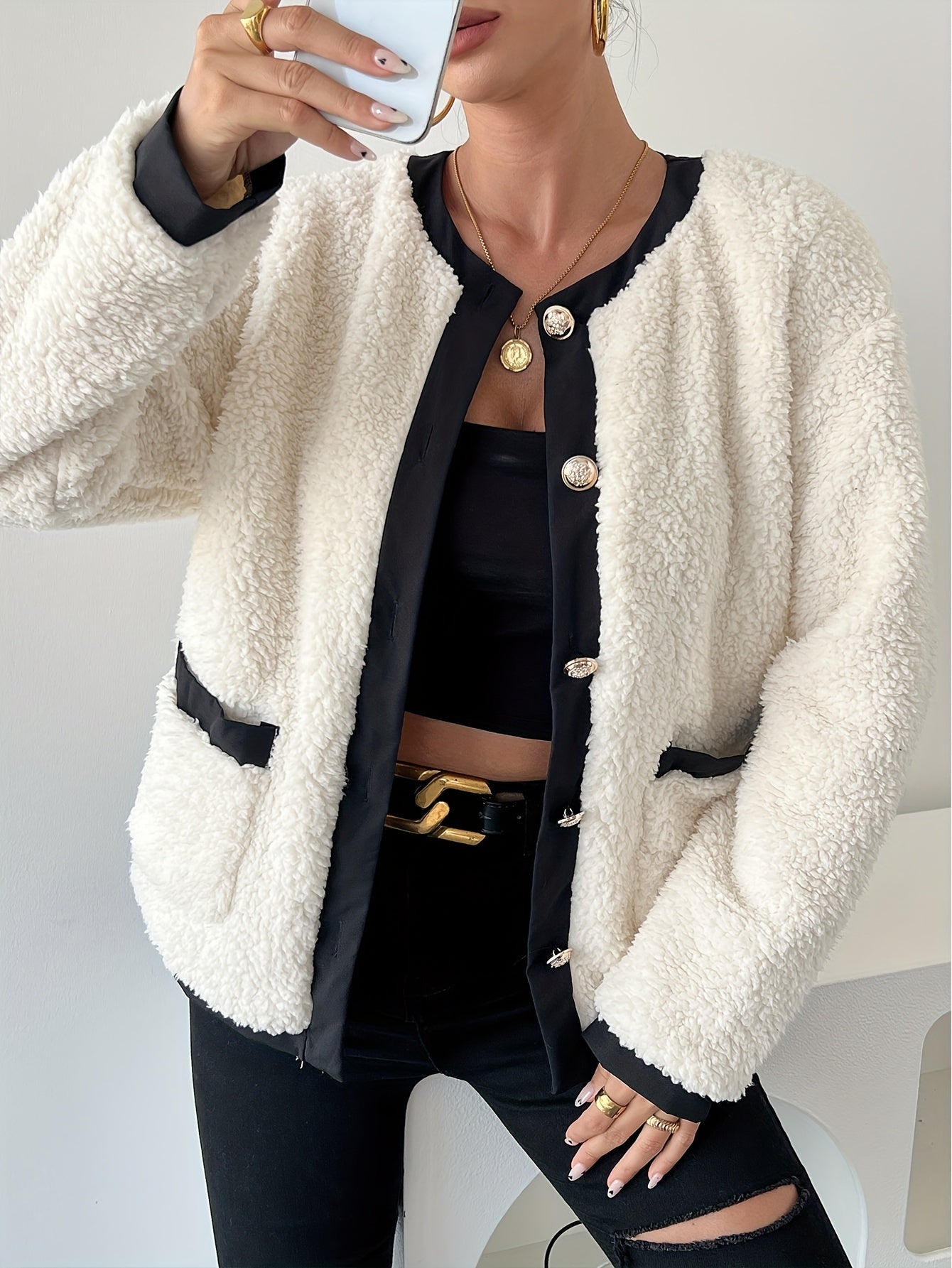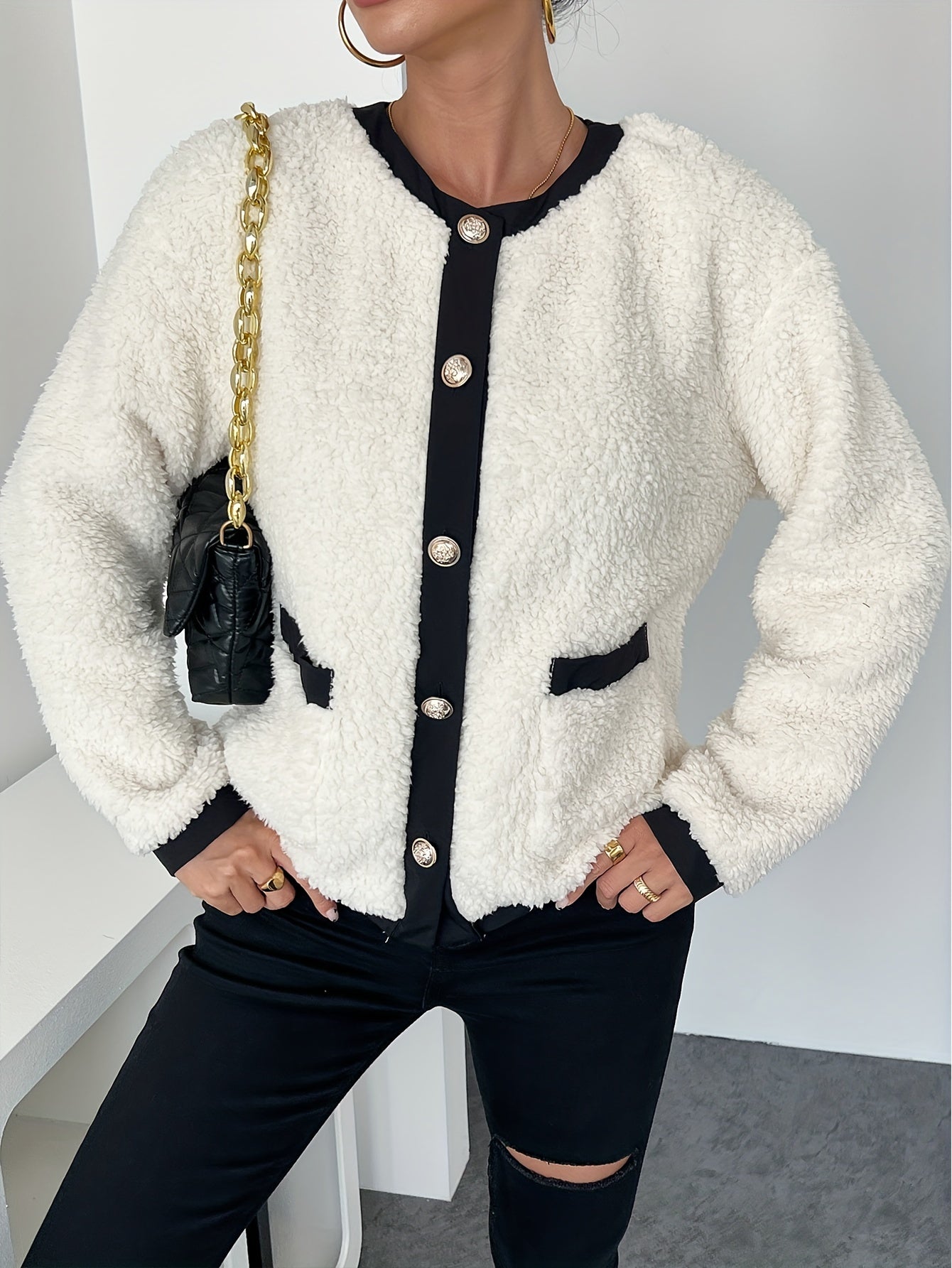 Kort Teddy Jakke med Kontrastkanter | Polyester | Stilfuld & Komfortabel