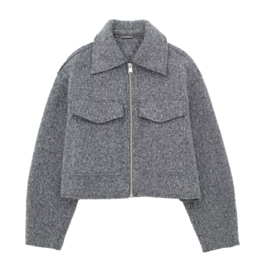 Denne korte uldjakke er det ideelle valg til overgangsperioder, hvor stil og komfort skal gå hånd i hånd. Den strukturerede overflade og den klassiske lynlåslukning giver jakken et råt, men sofistikeret udtryk. Med brystlommer og skarp krave bringer den et utility-inspireret look ind i en tidløs silhuet, som kan styles både afslappet og elegant.