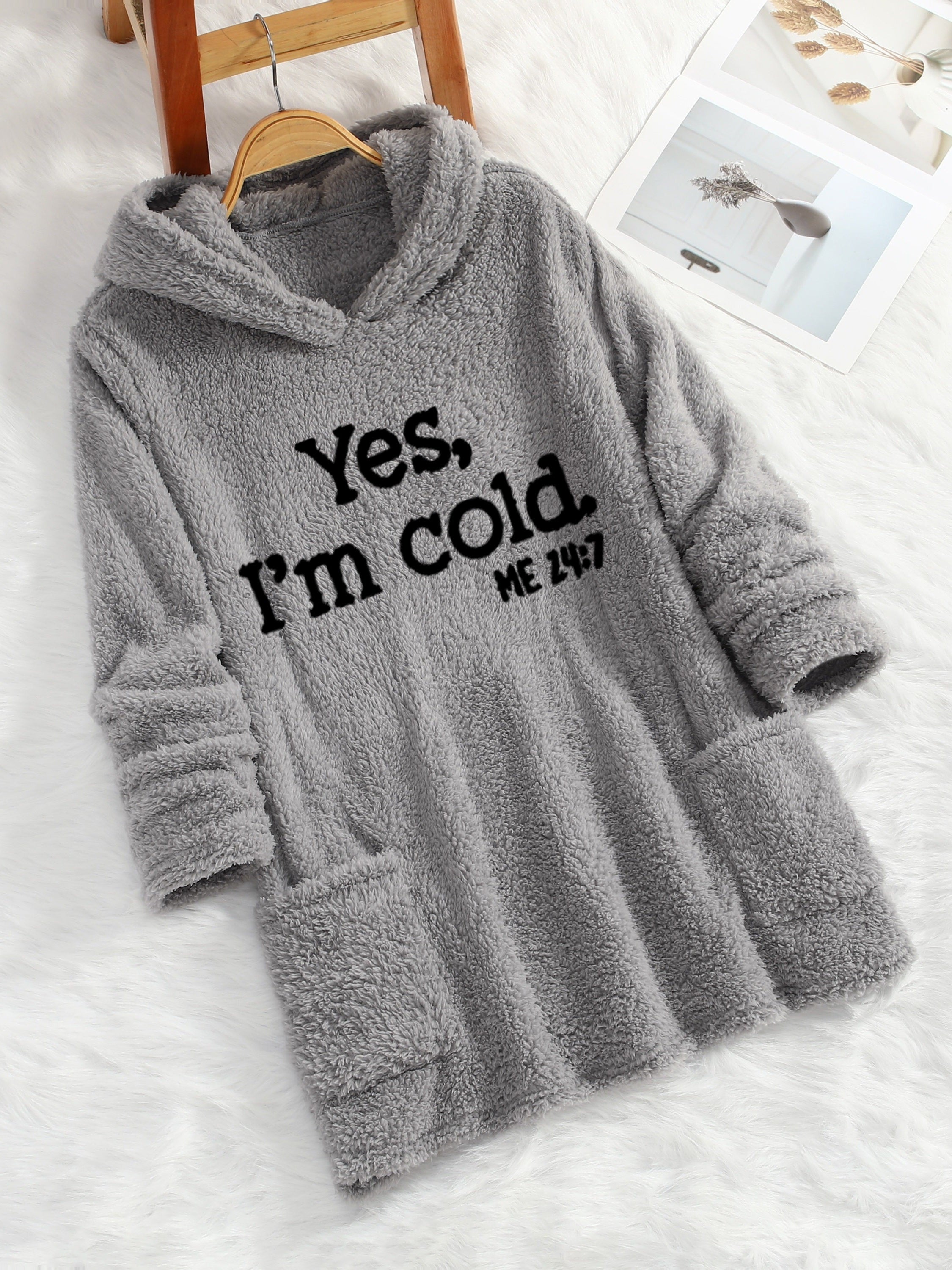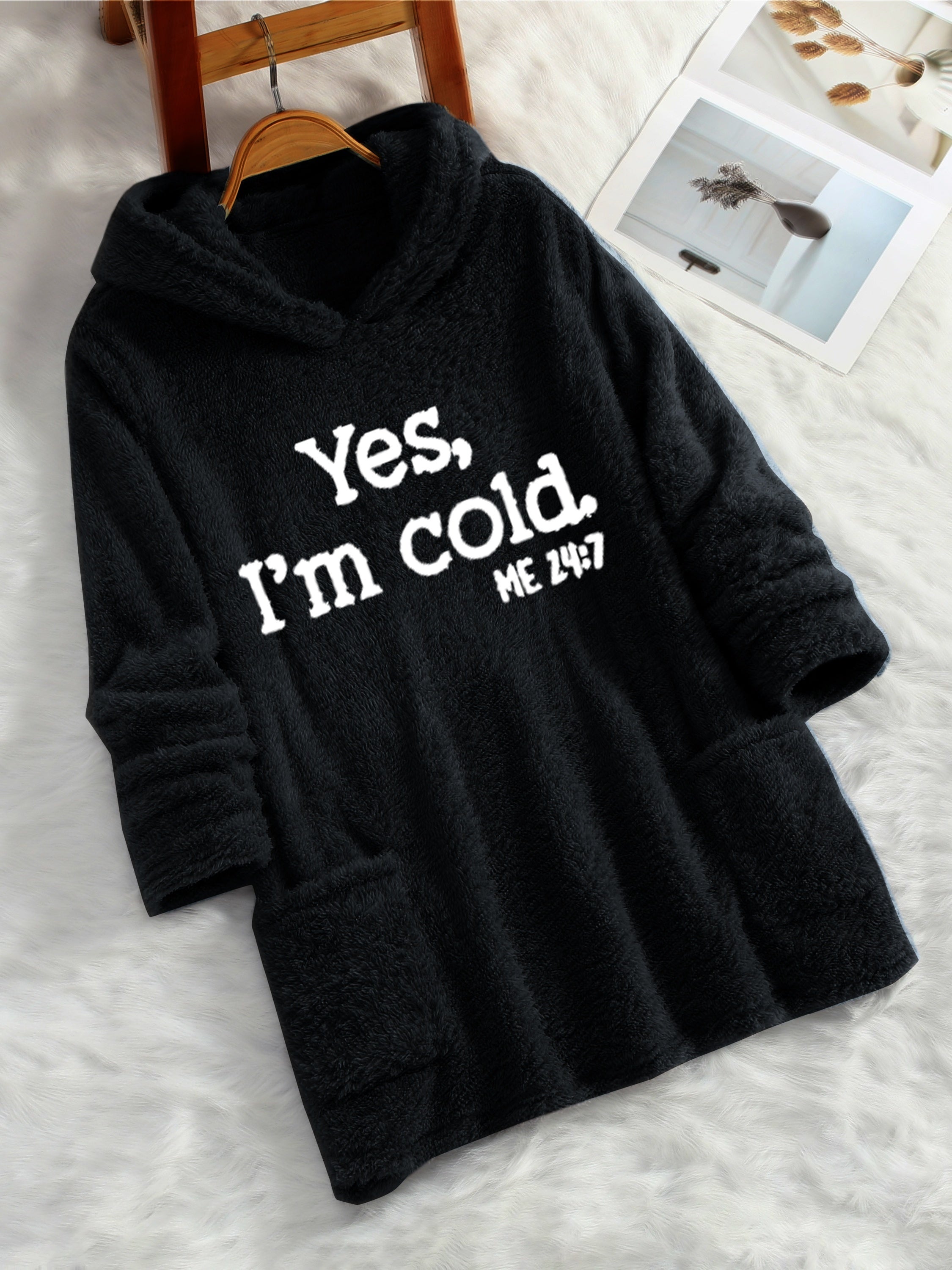 Denne lange hoodie i fleece er svaret på alle kolde dage! Med sit sjove “Yes, I’m cold” print og det ekstremt bløde materiale giver den både humor og varme i ét. Den rummelige pasform og store lommer gør den ideel til afslapning derhjemme, gåture i vinterkulden eller blot som en hyggelig overdel. Den indbyggede hætte beskytter mod vind og vejr, mens længden giver ekstra dækning og komfort.