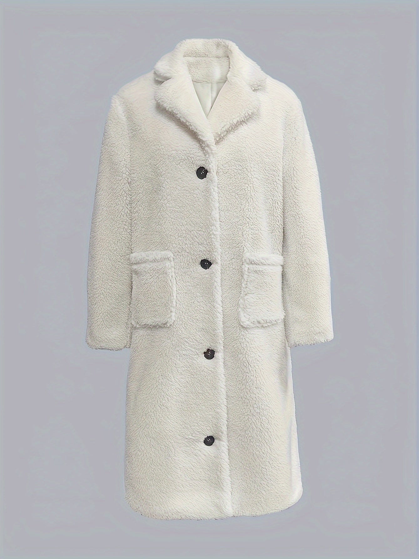 Denne lange teddyfrakke tilbyder både varme og stil med sin bløde overflade og klassiske snit. De store kontrastknapper, brede reverskrave og rummelige lommer skaber et eksklusivt og tidløst look. Perfekt til kolde dage, hvor du ikke vil gå på kompromis med elegance og komfort.