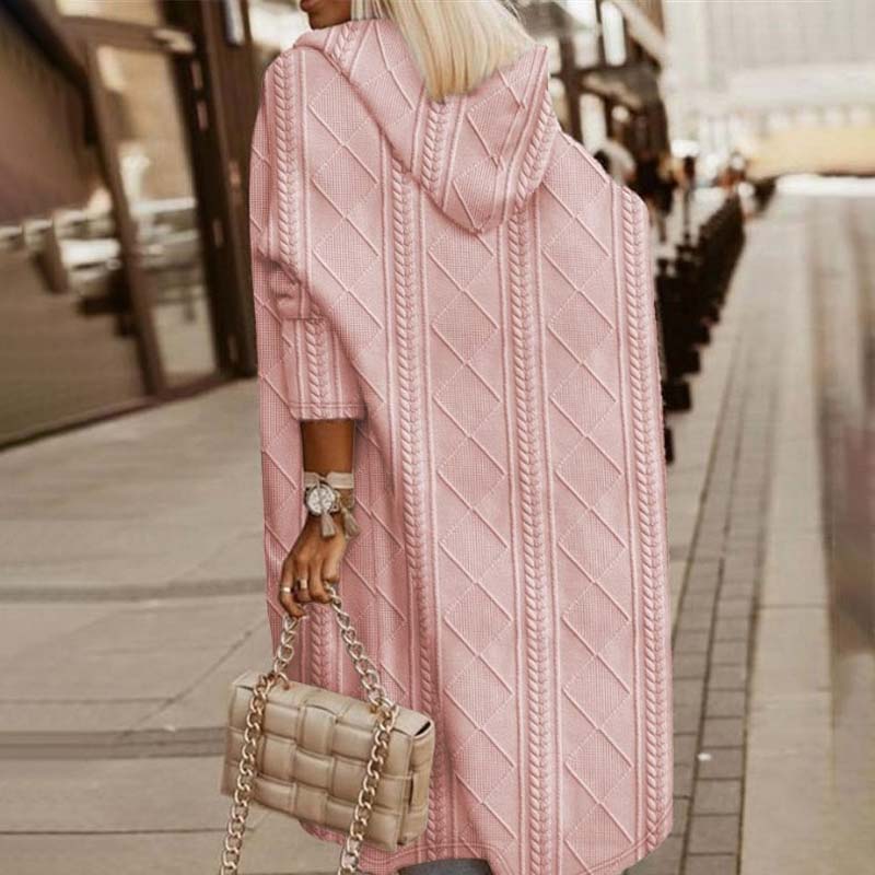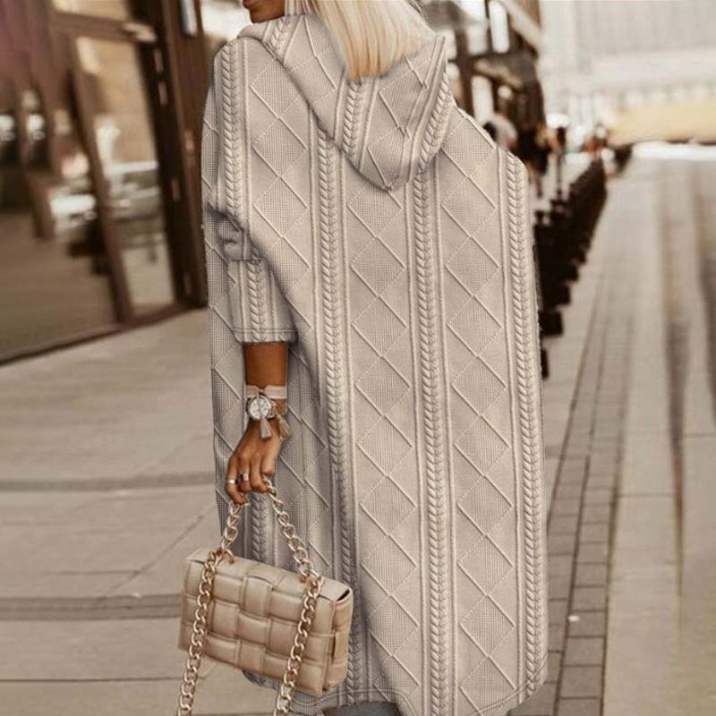 Denne lange hættecardigan er fremstillet i et markant kabelstrikket mønster, som tilfører både dybde og klassisk charme. Den åbne front og hætten gør den ideel til lag-på-lag styling, mens længden og materialet sikrer komfort på kølige dage. Et perfekt valg til dig, der ønsker en elegant hverdagsløsning med et strejf af urban stil.