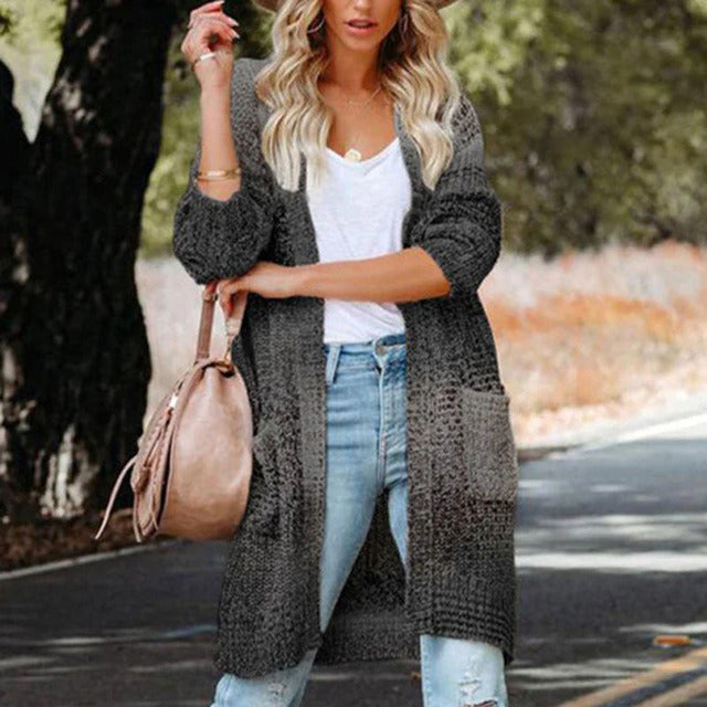 Lang Strikket Cardigan | Polyester | Komfortabel, Stilfuld