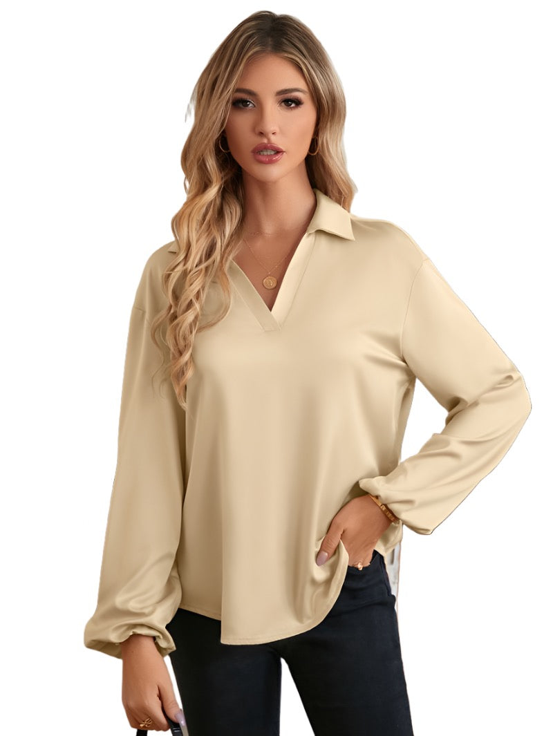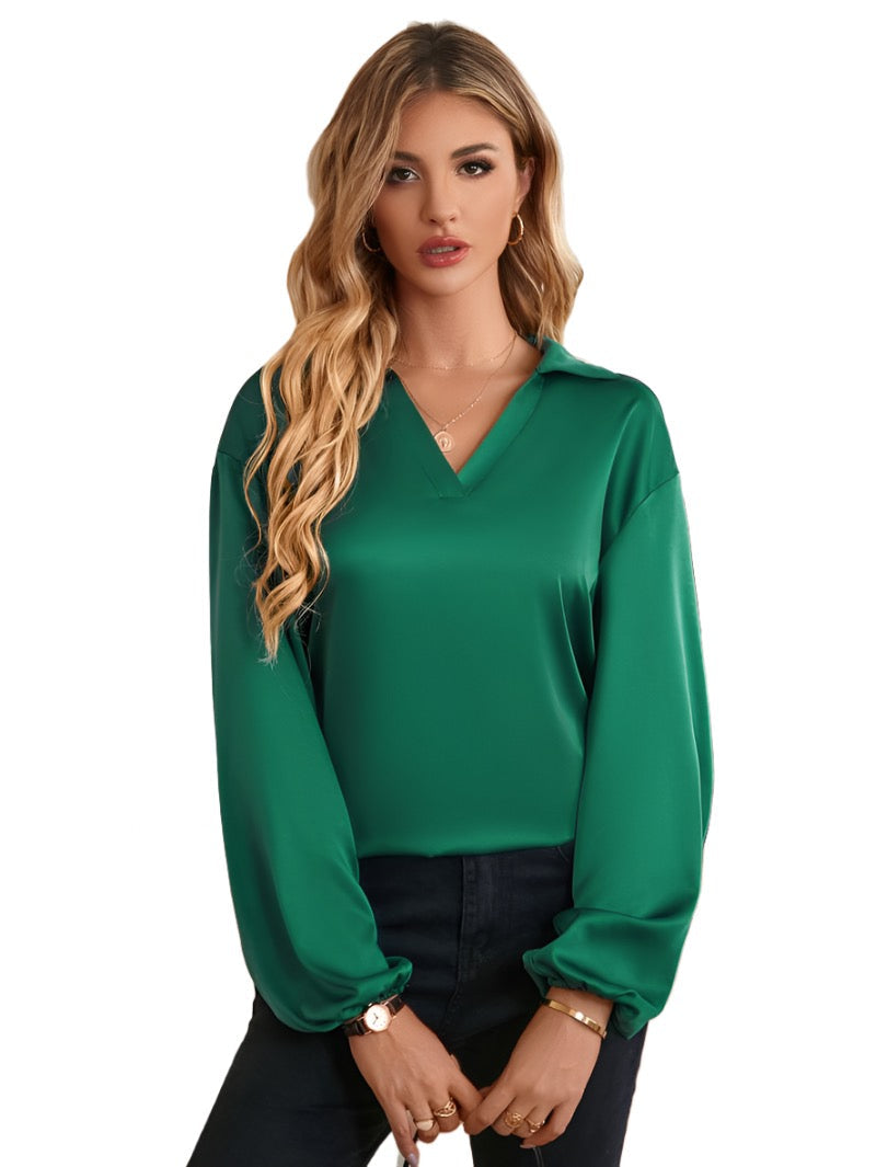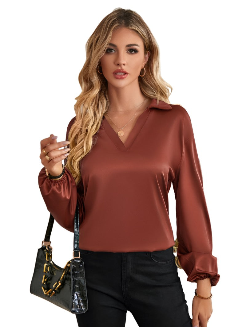 Denne elegante bluse er designet med en klassisk krave og en V-formet halsudskæring, som skaber et sofistikeret og tidløst look. De lange ærmer afsluttes med elastiske manchetter, der tilføjer let volumen og komfort. Det lette, bløde materiale gør den perfekt til både kontoret og afslappede hverdagsoutfits.