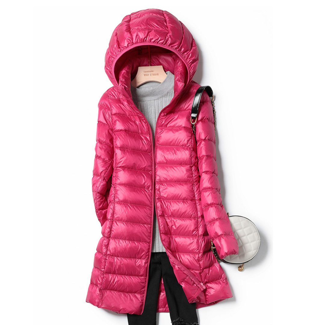 Denne lange dunjakke kombinerer varme og stil i en elegant silhuet. Den quiltede struktur giver et flatterende snit, mens den integrerede hætte og gennemgående lynlås gør jakken perfekt til både hverdagsbrug og overgangsvejr. Jakken er let i vægt men yder effektiv beskyttelse mod kulde og vind.