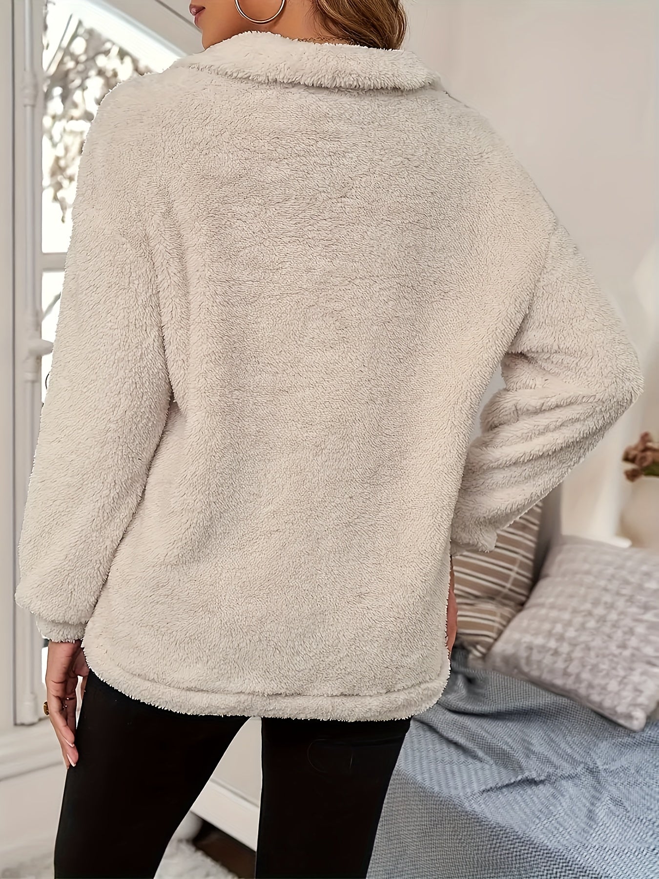 Denne teddyfleecetrøje er det oplagte valg til kolde dage, hvor du ønsker maksimal blødhed og et afslappet look. Det fluffy materiale holder dig varm, mens halv lynlås og praktisk kængurulomme gør den både funktionel og stilfuld. En must-have til hverdagskomfort og hjemlig hygge.